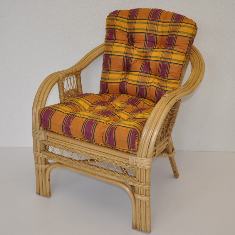 Kreslo Rio De Janeiro je vyrobené z prírodného ratanu. | Konštrukcia ratanovej stoličky je na väčšine miest trojitá, a teda veľmi pevná. Kreslo je veľmi pohodlné vďaka svojmu rozloženému tvaru a kvalitným vankúšom. Farba ratanovej konštrukcie a ratanového výpletu je medová. Rozmery stoličky sú 68x75x74 cm. Nosnosť stoličky je 125 kg. Výška sedadla je 44 cm. Vankúše na kreslá sa vyrábajú v Českej republike a vyznačujú sa vysokou kvalitou spracovania.