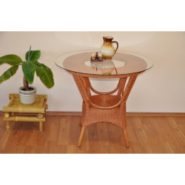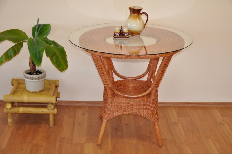 Ratanový stolík Wanuta je vyrobený z prírodného ratanu s pevnou ratanovou konštrukciou a výpletom z ratanových prútikov s priemerom 3 mm, farba ratanovej konštrukcie "cognac" > | výška stolíka 77 cm, priemer sklenenej dosky 85 cm, nosnosť 30 kg