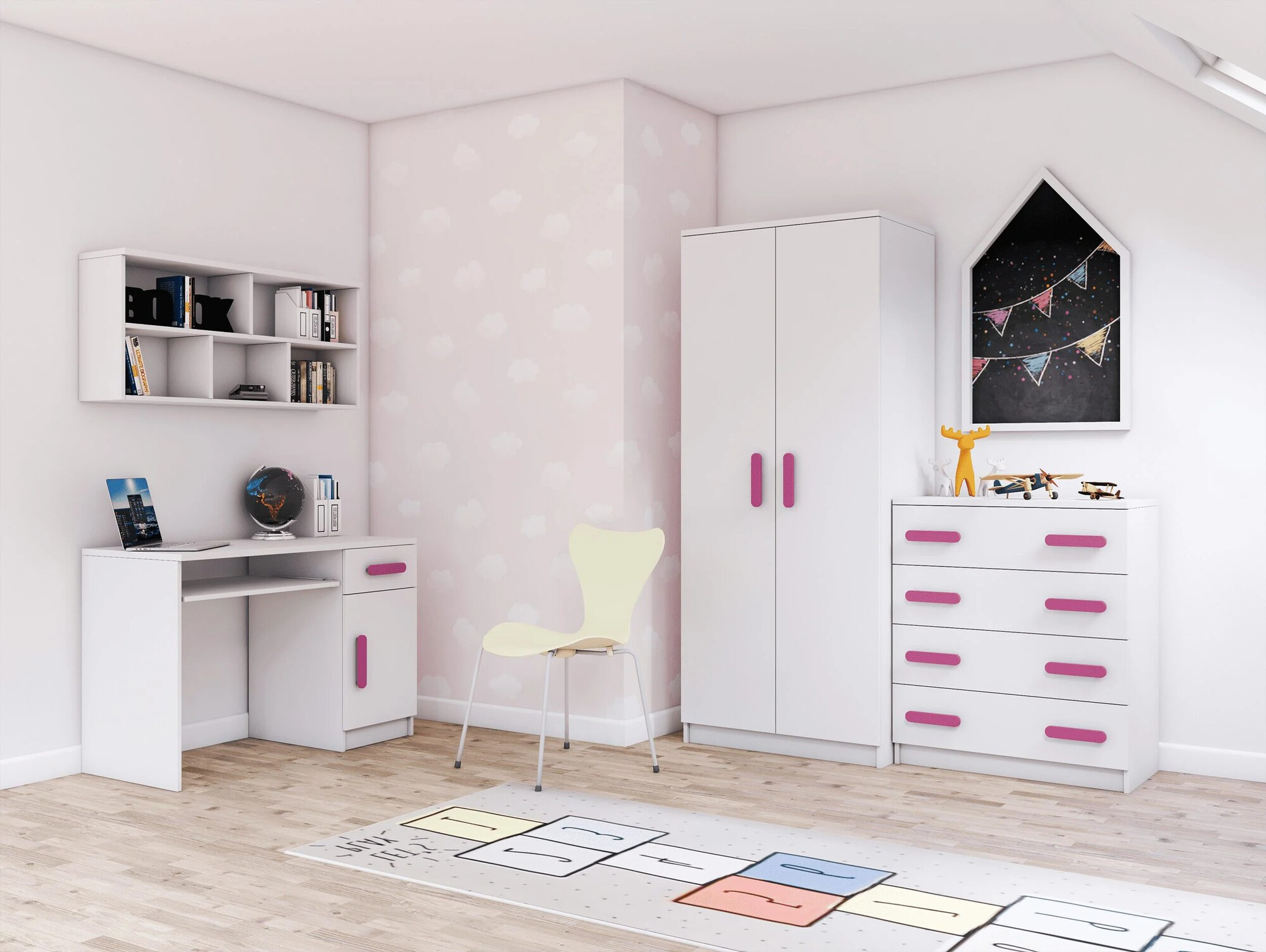 Moderný rad nábytku SMYK I poteší svojou jednoduchosťou a eleganciou, kombinujúc klasickú bielu farbu korpusu a čiel. Ďalším prvkom, ktorý odlišuje "Smyk I", sú ozdobné drevené úchytky, ktoré sú k dispozícii v rôznych farbách. Práve tie dodávajú nábytku charakter a vytvárajú v detskej izbe jedinečnú a jemnú atmosféru.