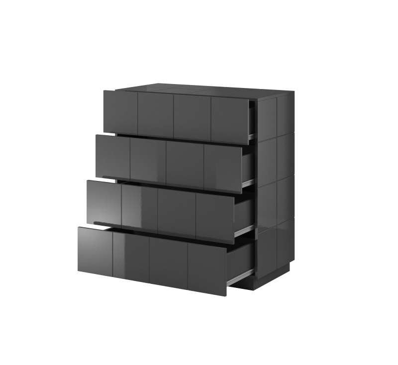 komoda KOM4S REJA Rozmery s nožičkami: š/š 104cm/91cm/45cm Rozmery bez nožičiek: š/š 99cm/91cm/45cm Materiál Boky a vrchná doska: MDF frézovaná v lesku Čelá/zásuvky: MDF frézovaná v lesku Ostatné prvky: laminovaná drevotrieska Úchyty: žiadne, čelá končia nad vrchnou doskou Nožičky: čierny plast alebo sokel Osvetlenie: lepiaca páska pripevnená k soklu Dostupné farby: biela, modrá