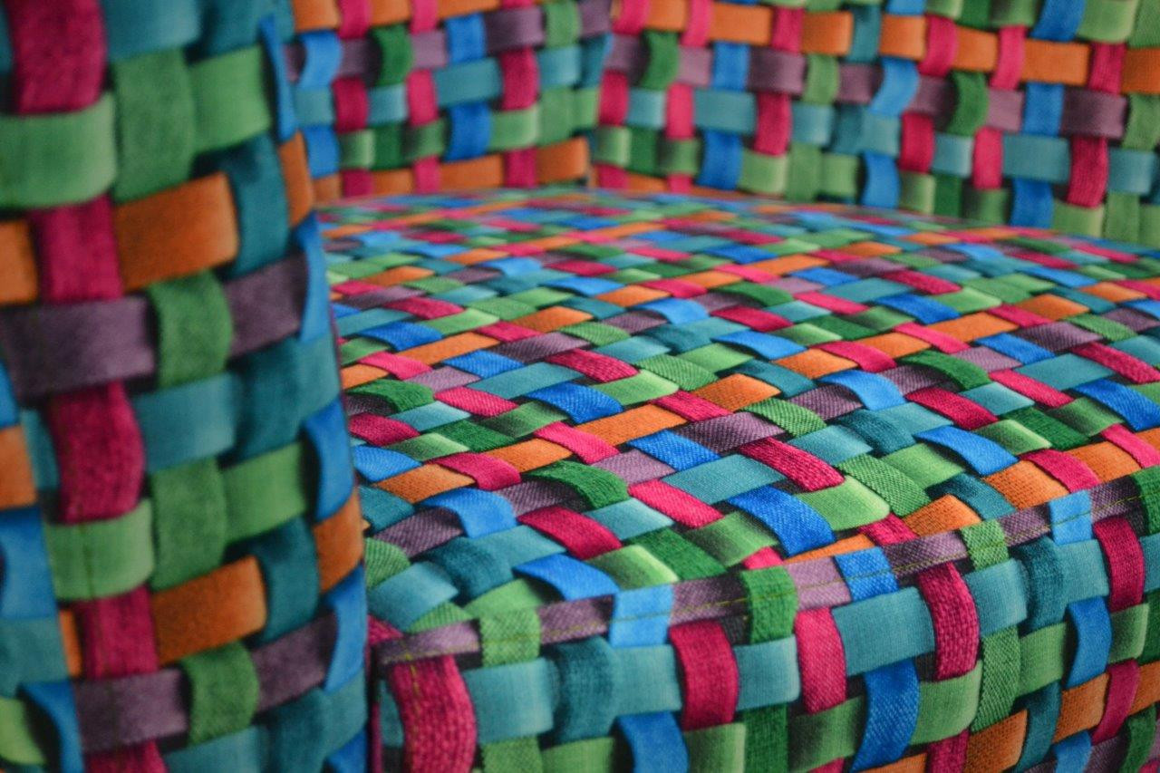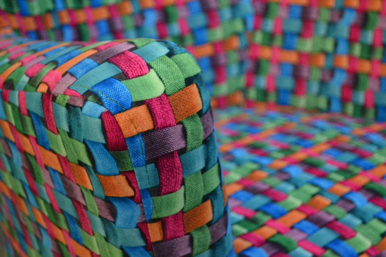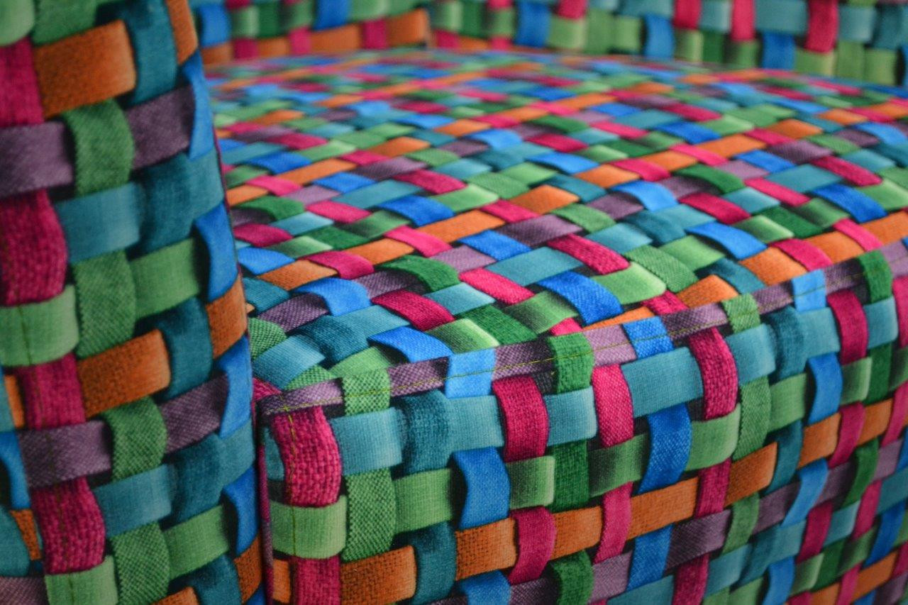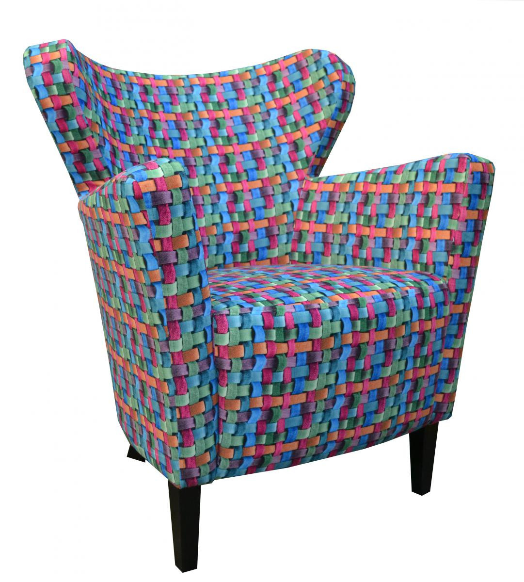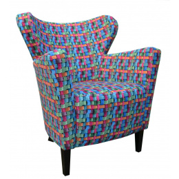 Relaxačné kreslo Minoe je vyrobené v obľúbenom retro štýle. Kreslo má drevené nohy zafarbené do tmavého odtieňa a je čalúnené látkou s farebným 3D vzorom.