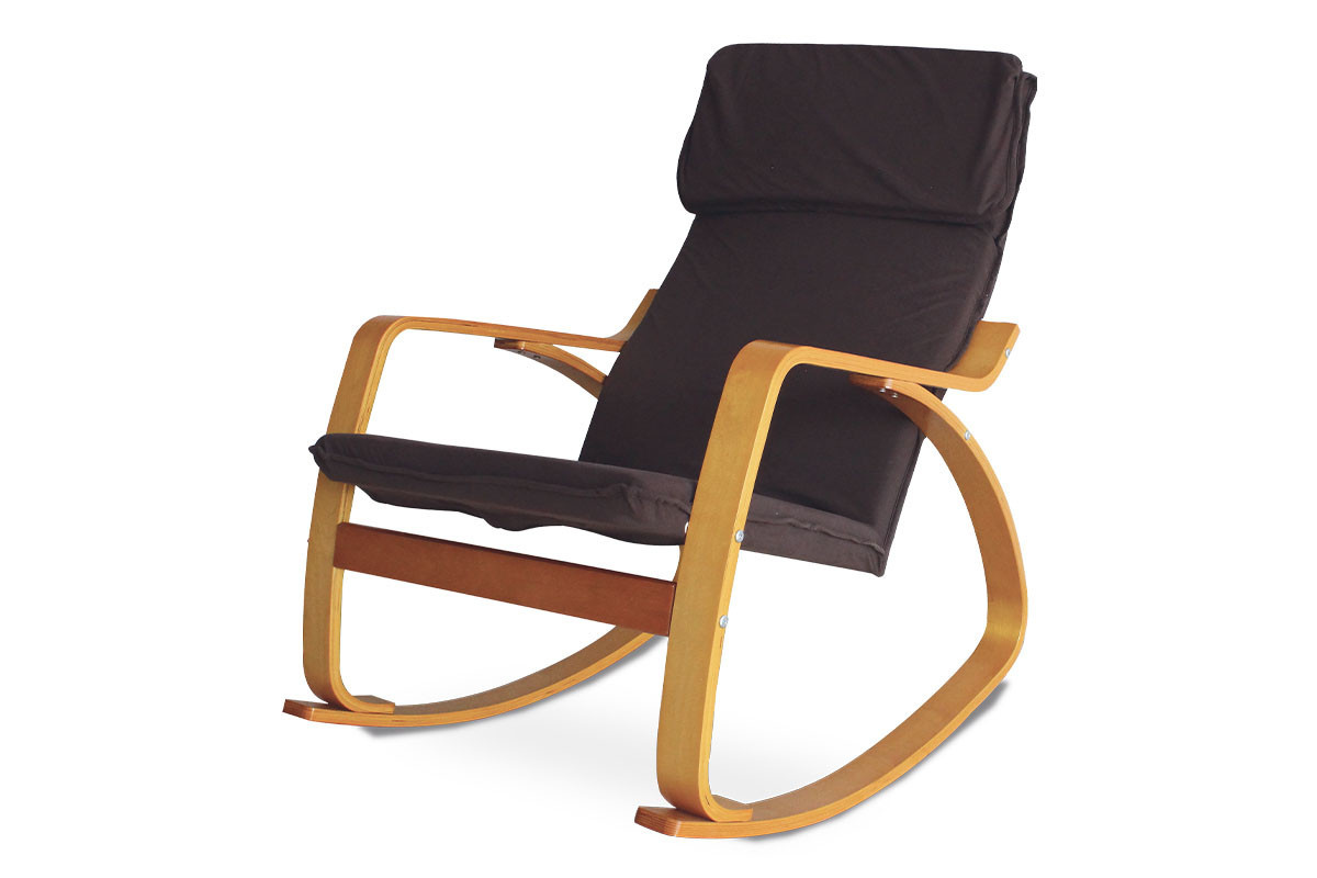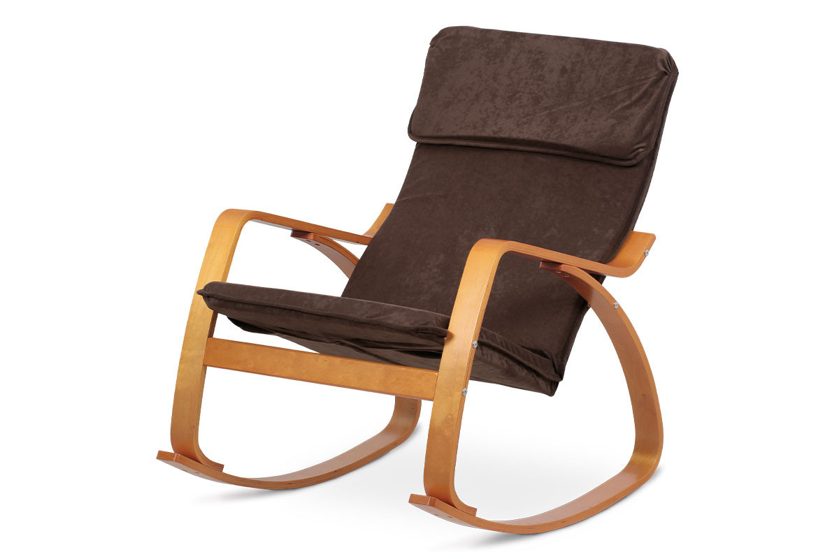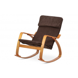 Hojdacie kreslo, čalúnenie tmavohnedá látka, ohýbaná preglejka, morenie čerešňa