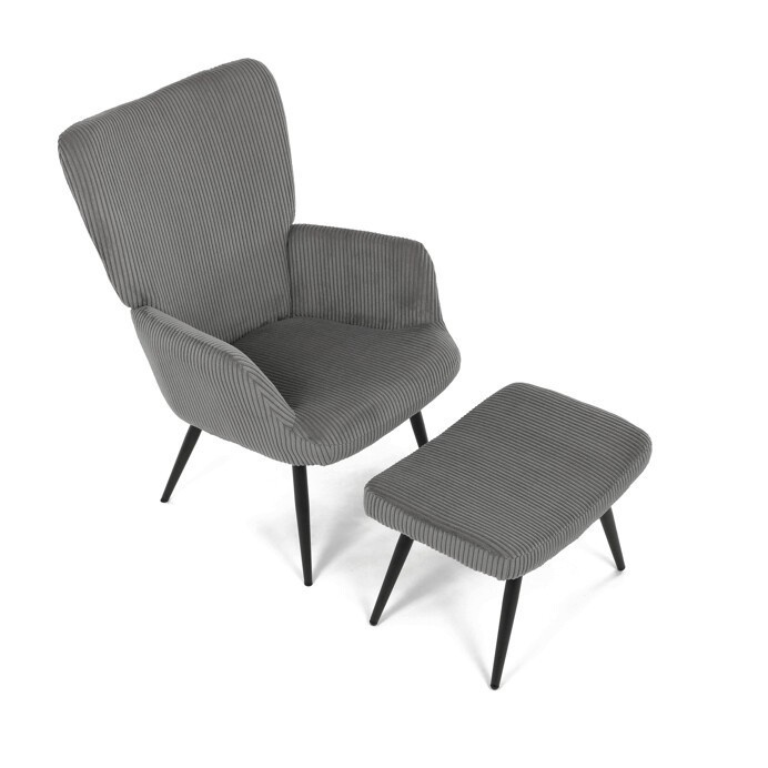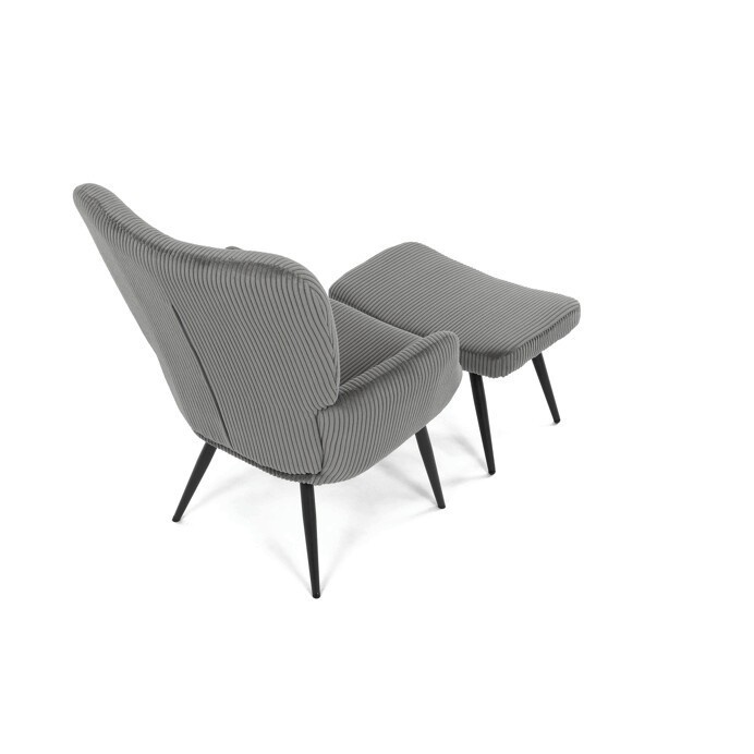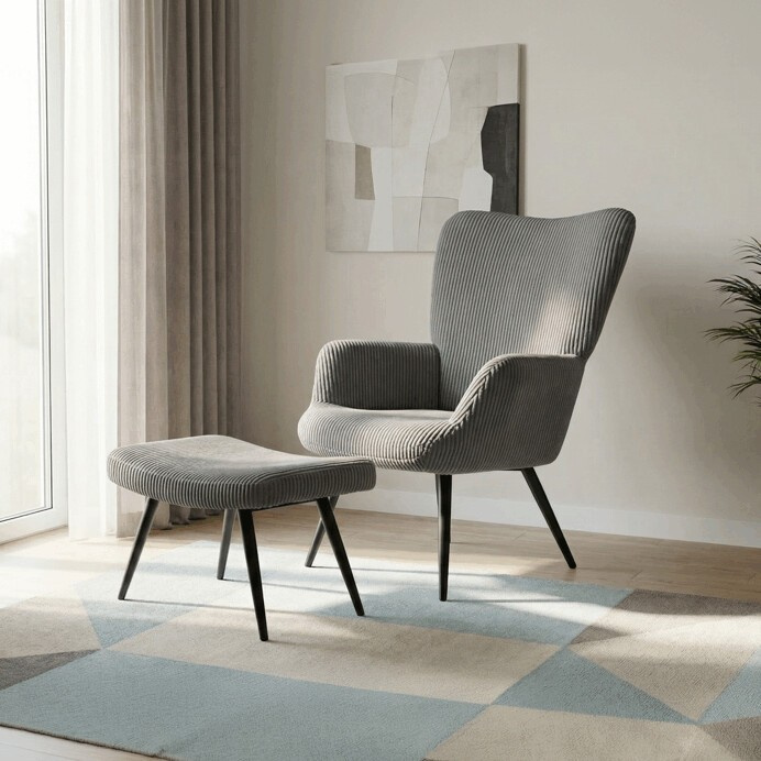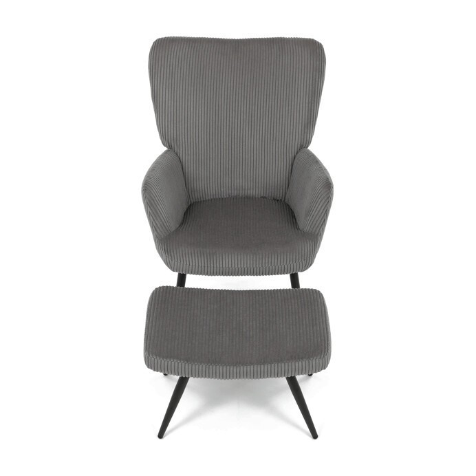 Relaxační křeslo s podnožkou v šedém manšestru nabízí pohodlí a styl v jednom. Potah z manšestrové látky je příjemný na dotek a zároveň snadno udržovatelný, zatímco černé kovové nohy zajišťují stabilitu a pevnost celé sestavy. Křeslo je vybaveno pevnými područkami, které podporují správnou ergonomii při sezení. Bonusový taburet umožňuje pohodlné opření nohou a přispívá k celkovému relaxačnímu zážitku. Díky svým rozměrům a designu se hodí do moderních i klasických interiérů.