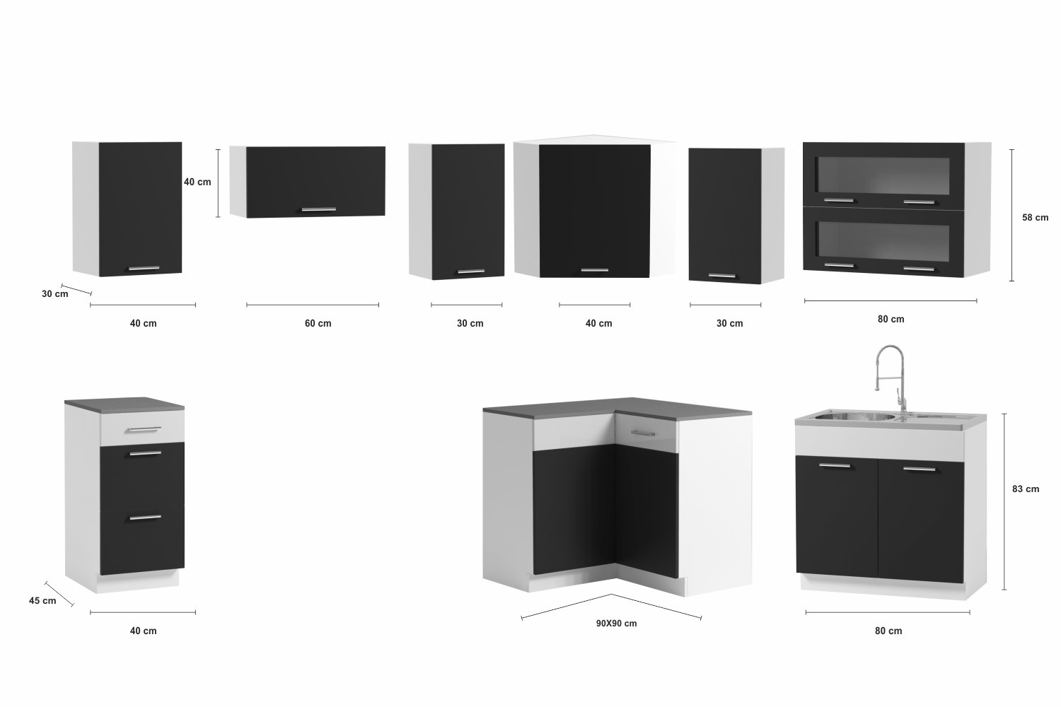 rohová skrinka 80x80 cm, v.83 cm Skutočná veľkosť skrinky bez pracovnej dosky je 80x80 cm/výška 83 cm, s pracovnou doskou je 90x90 cm. V prípade, žesi chcete nad túto skrinku dokúpiť dosku, musíte si objednať delenú dosku 90 a 30 cm