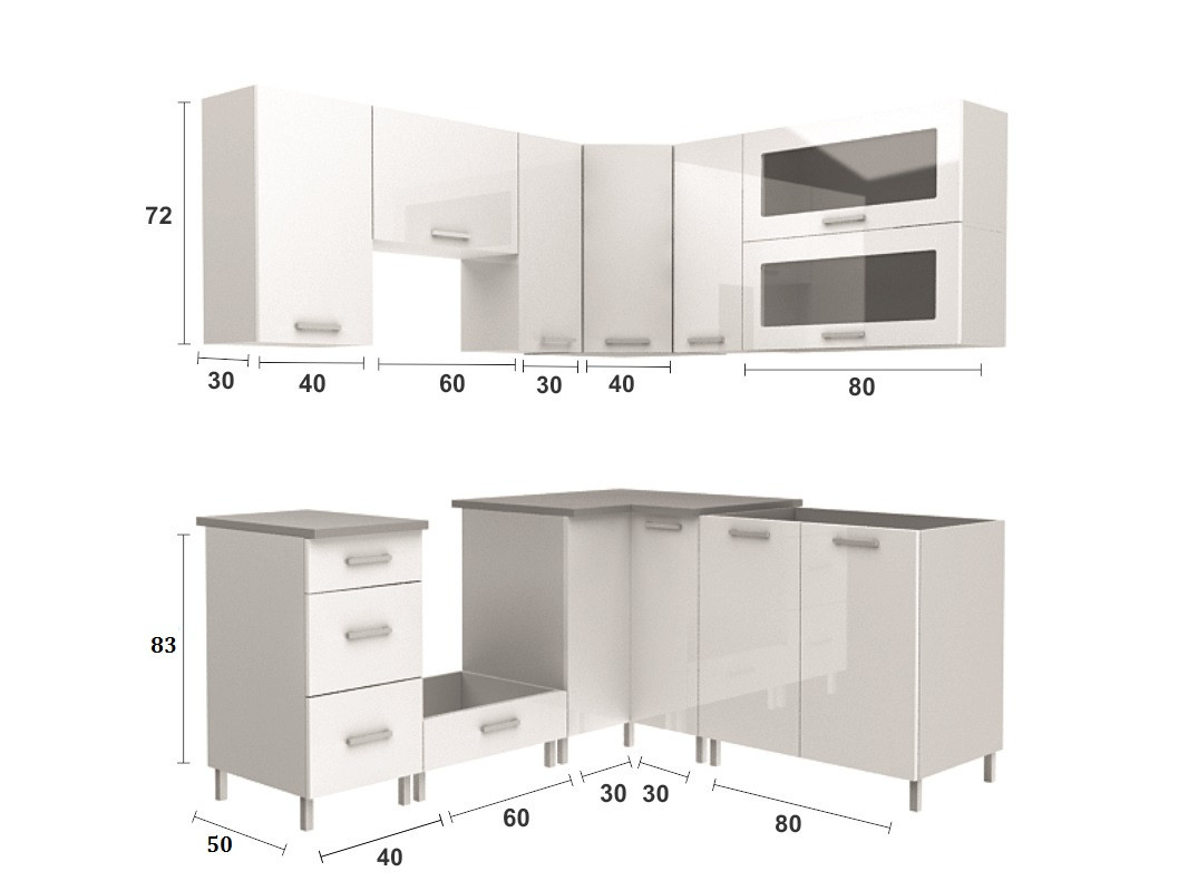 Rohová kuchyňa Grepolis v modernom dizajne je vyrobená tak, aby ste si ju mohli zostaviť podľa vlastných predstáv. Hodí sa do každého typu kuchyne a ponúka dostatok úložného priestoru. Kuchynská linka je na nožičkách, vďaka čomu je priestor pod linkou prístupnejší na čistenie. Korpusy skriniek sú biele, dvierka sú vo vysokom lesku v niekoľkých módnych odtieňoch a s tromi typmi úchytiek. Všetky tieto možnosti nájdete v našej ponuke a určite si vyberiete tú správnu pre vašu kuchyňu. Skrinky sa dodávajú v demontovanom stave. Montážny plán vrátane všetkých potrebných spojovacích prvkov je súčasťou balenia. Cena je uvedená za zostavu zobrazenú na úvodnej fotografii BEZ pracovnej dosky, s úchytkami zobrazenými na ďalších fotografiách. Zobrazené spotrebiče, príslušenstvo a dekorácie nie sú súčasťou dodávky. Fotografia je len ilustračná. Správna farba sivého lesku je zobrazená na dodatočnej fotografii!