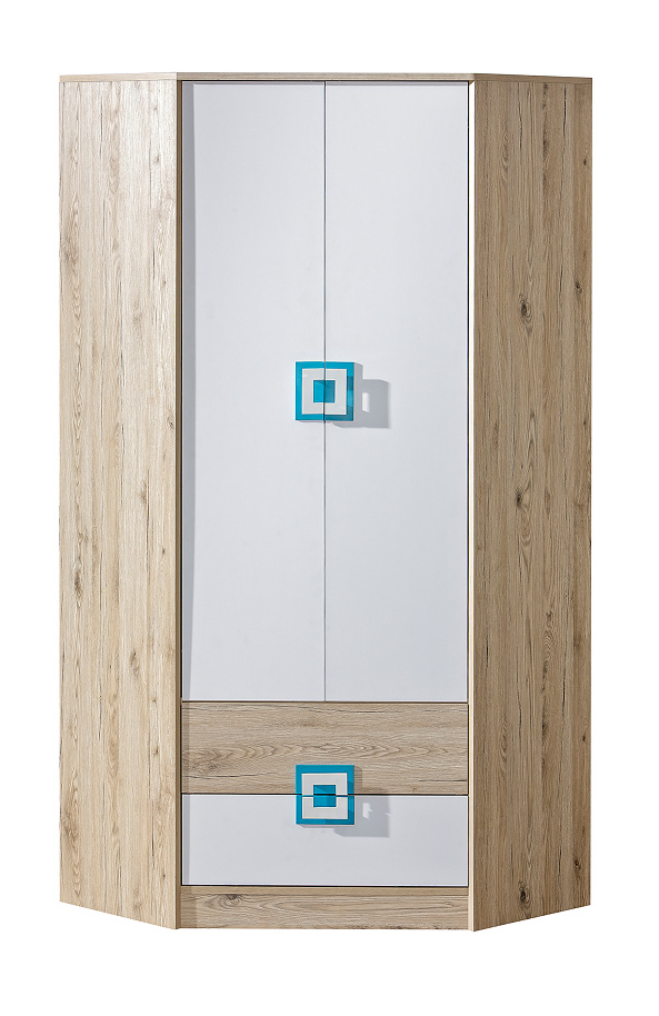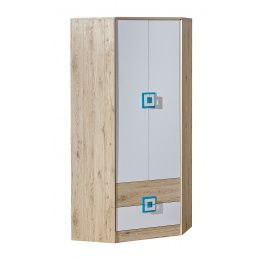 Rohová šatní skriňa NICO 02, Svetlý Dub/Biela/Tyrkysová