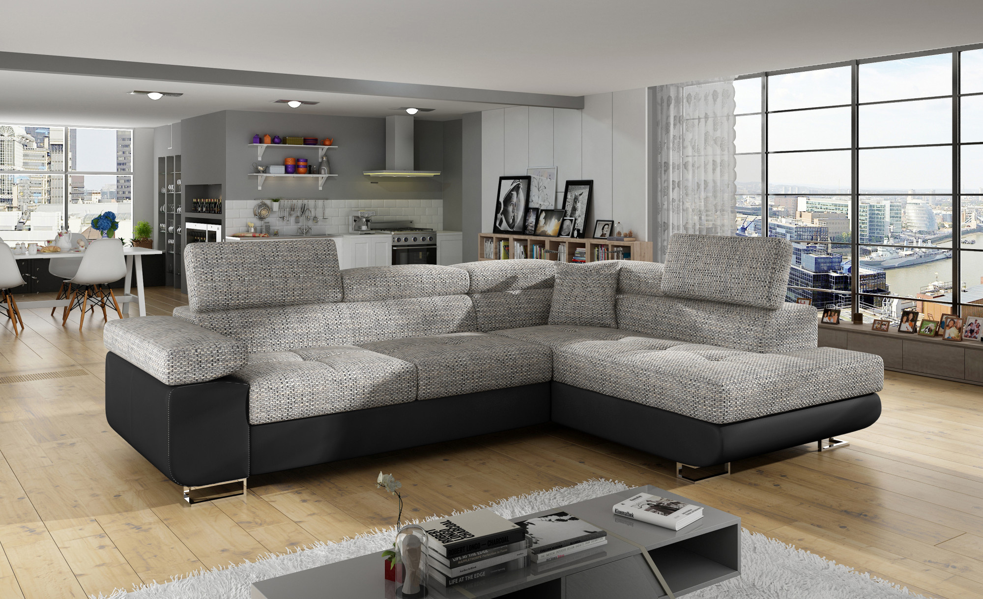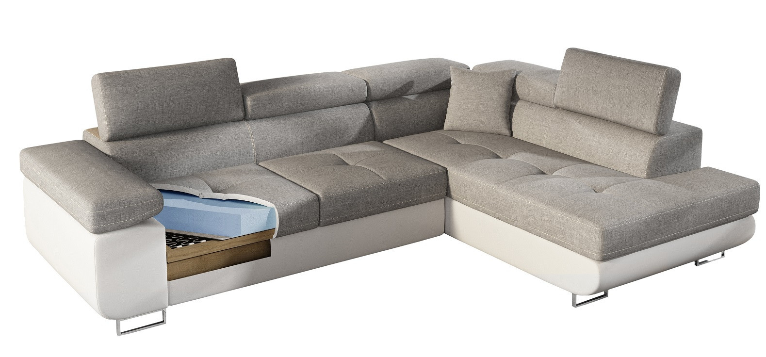 Rohová sedacia súprava ATOS je vyrobená z kvalitných materiálov.Konštrukcia pohovky je vyrobená z kombinácie dreva a drevotriesky. Sedacia časť je vyrobená z kombinácie polyuretánovej peny T3040+T2542 a vlnitých pružín. Na podopretie pohovky sa používa polyuretánová pena T2542/T3040.Sedacia súprava je rozkladacia pomocou rozkladacieho typu Dolphin. Pohovka má priestranný úložný priestor na uloženie posteľnej bielizne.