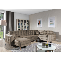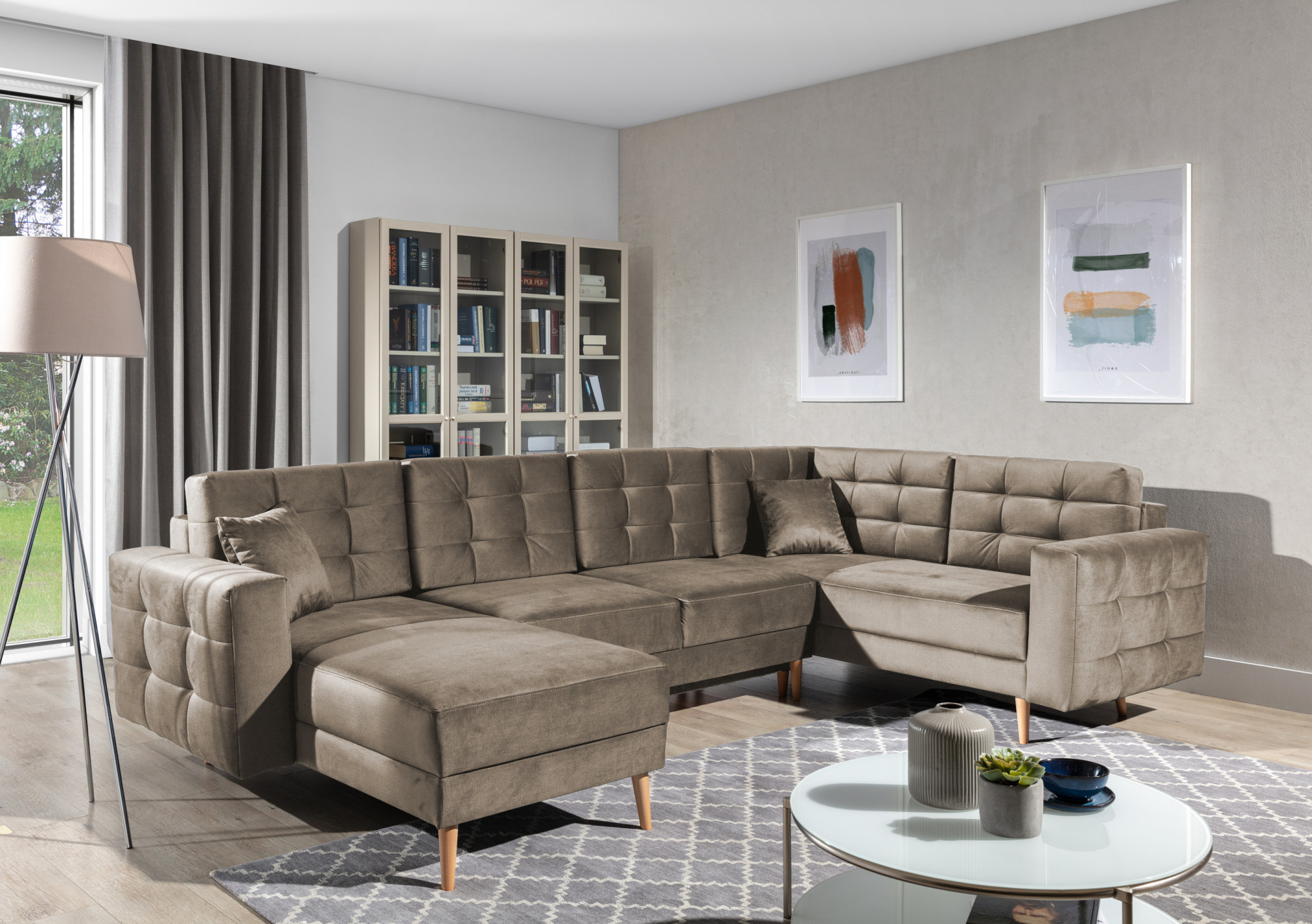 Rohová sedacia súprava Asgard U je vyrobená z vysokokvalitných materiálov.Konštrukcia pohovky je vyrobená z kombinácie dreva a drevotriesky. Sedacia časť je vyrobená v kombinácii polyuretánovej peny T3030, polyuretánovej peny T2140 a kostí Faliste.Sedacia súprava je rozkladacia pomocou systému DL Automatic. Pohovka má priestranný úložný priestor na uloženie posteľnej bielizne.