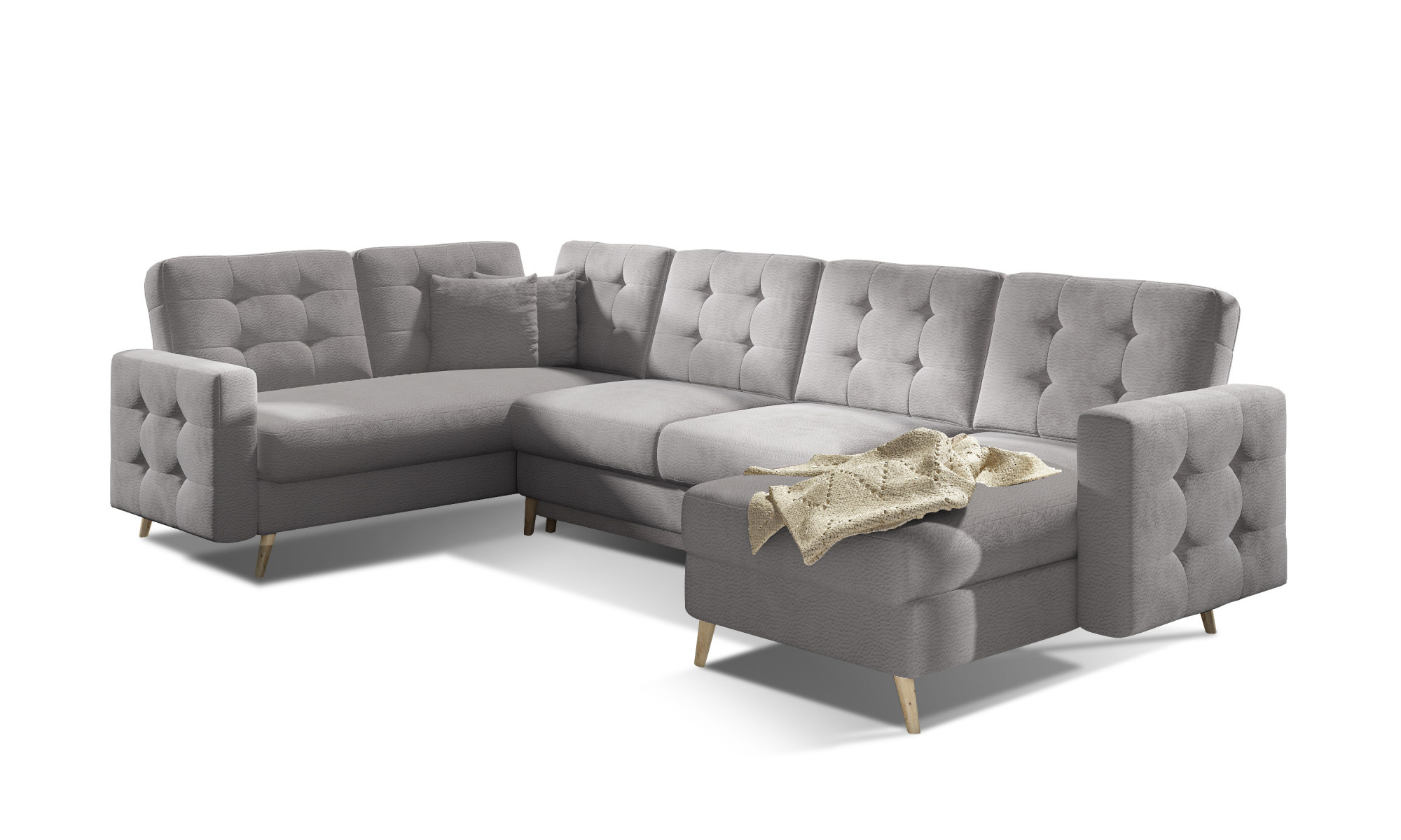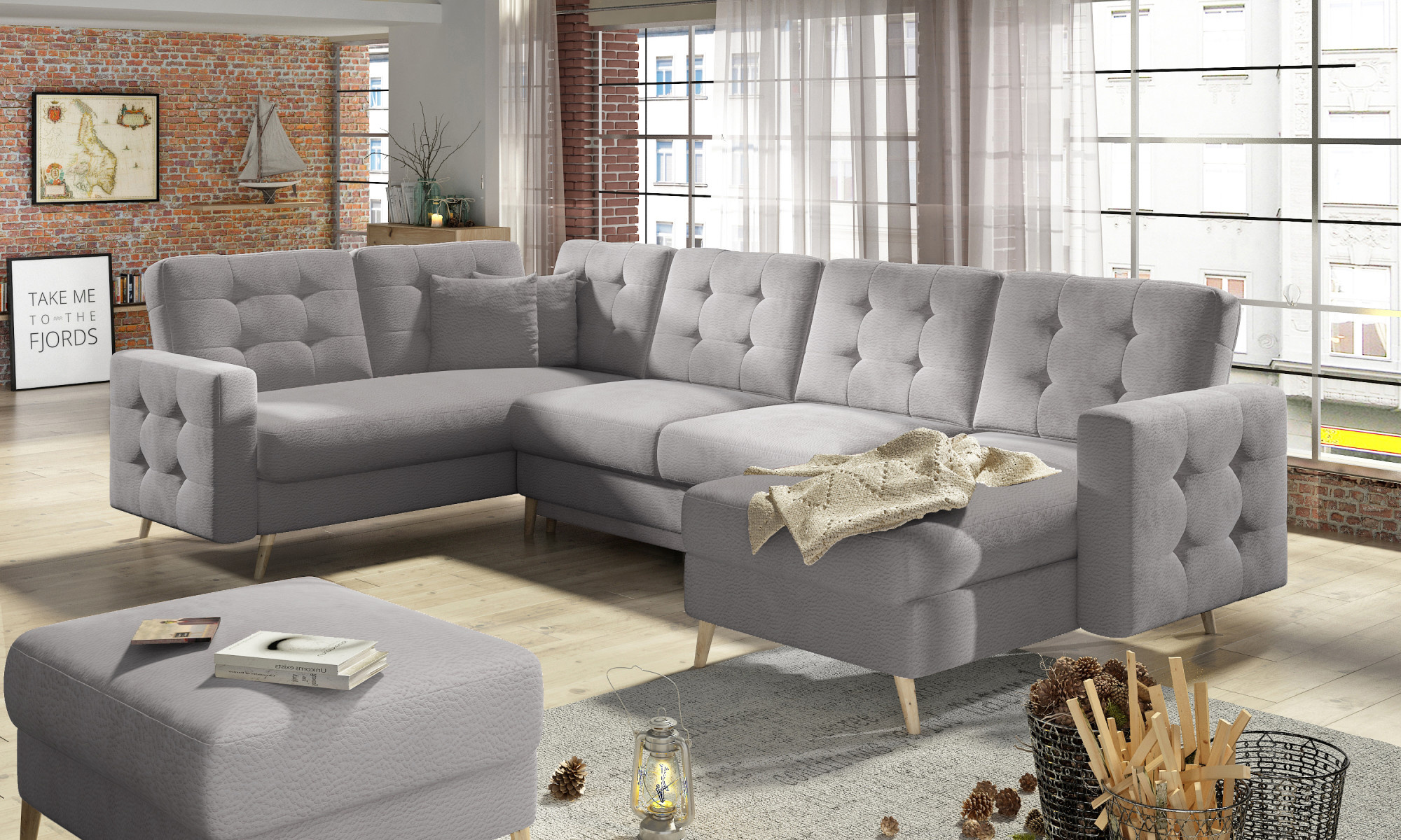 Rohová sedacia súprava Asgard U je vyrobená z vysokokvalitných materiálov.Konštrukcia pohovky je vyrobená z kombinácie dreva a drevotriesky. Sedacia časť je vyrobená v kombinácii polyuretánovej peny T3030, polyuretánovej peny T2140 a kostí Faliste.Sedacia súprava je rozkladacia pomocou systému DL Automatic. Pohovka má priestranný úložný priestor na uloženie posteľnej bielizne.