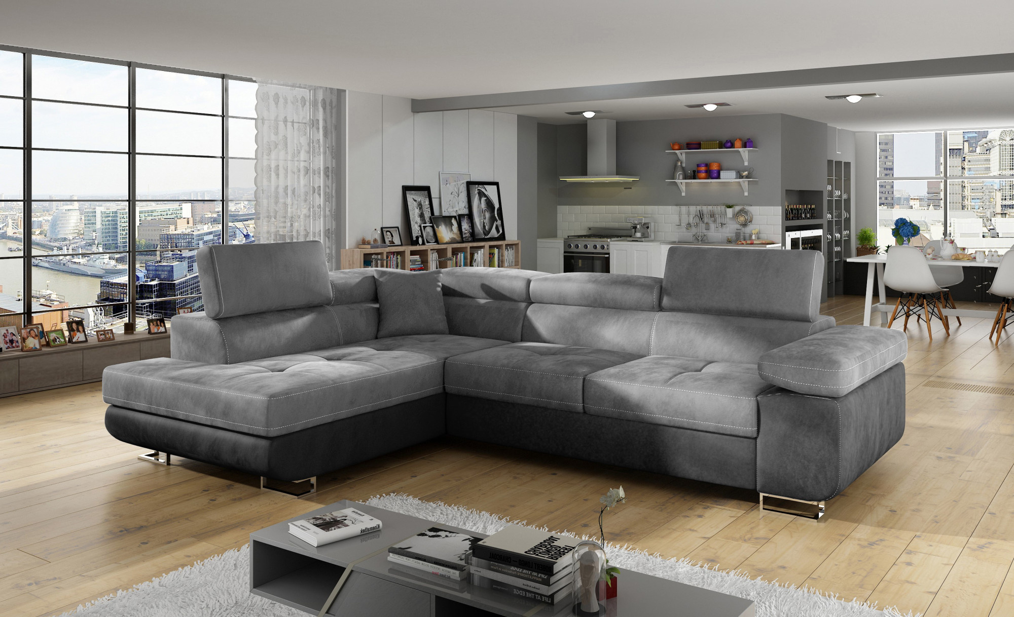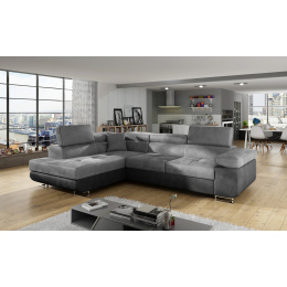Rohová sedacia súprava ATOS je vyrobená z kvalitných materiálov.Konštrukcia pohovky je vyrobená z kombinácie dreva a drevotriesky. Sedacia časť je vyrobená z kombinácie polyuretánovej peny T3040+T2542 a vlnitých pružín. Na podopretie pohovky sa používa polyuretánová pena T2542/T3040.Sedacia súprava je rozkladacia pomocou rozkladacieho typu Dolphin. Pohovka má priestranný úložný priestor na uloženie posteľnej bielizne.