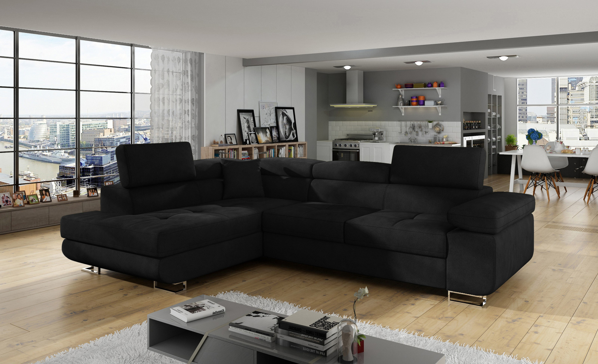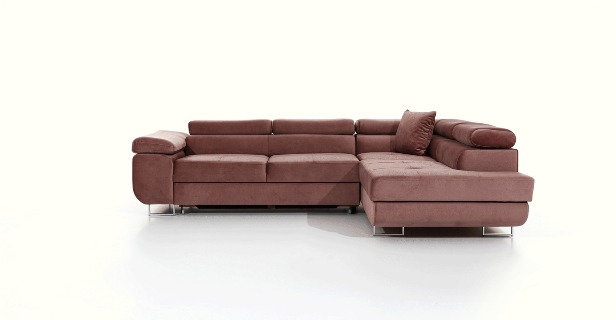 Rohová sedacia súprava ATOS je vyrobená z kvalitných materiálov.Konštrukcia pohovky je vyrobená z kombinácie dreva a drevotriesky. Sedacia časť je vyrobená z kombinácie polyuretánovej peny T3040+T2542 a vlnitých pružín. Na podopretie pohovky sa používa polyuretánová pena T2542/T3040.Sedacia súprava je rozkladacia pomocou rozkladacieho typu Dolphin. Pohovka má priestranný úložný priestor na uloženie posteľnej bielizne.