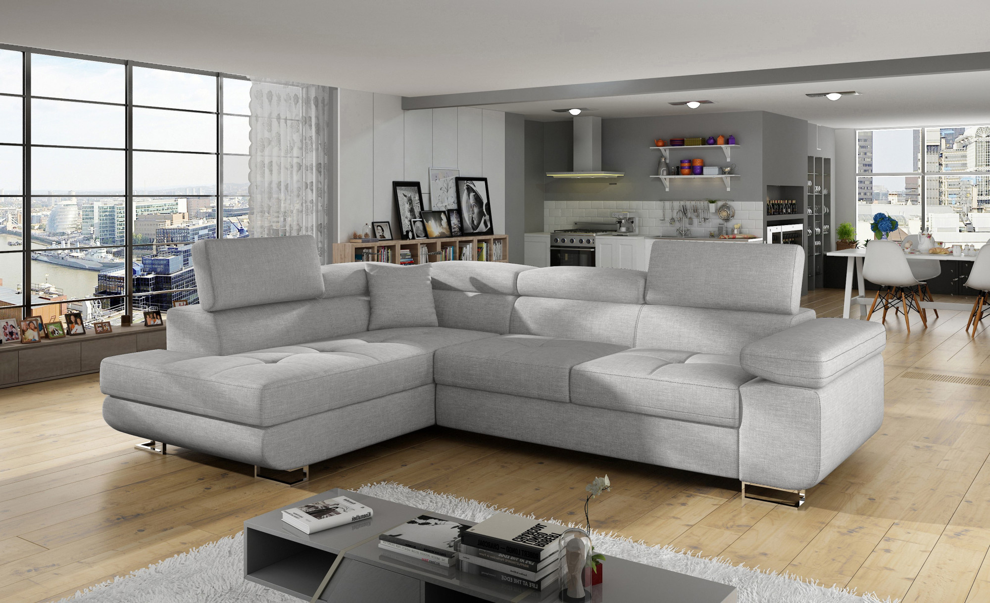 Rohová sedacia súprava ATOS je vyrobená z kvalitných materiálov.Konštrukcia pohovky je vyrobená z kombinácie dreva a drevotriesky. Sedacia časť je vyrobená z kombinácie polyuretánovej peny T3040+T2542 a vlnitých pružín. Na podopretie pohovky sa používa polyuretánová pena T2542/T3040.Sedacia súprava je rozkladacia pomocou rozkladacieho typu Dolphin. Pohovka má priestranný úložný priestor na uloženie posteľnej bielizne.