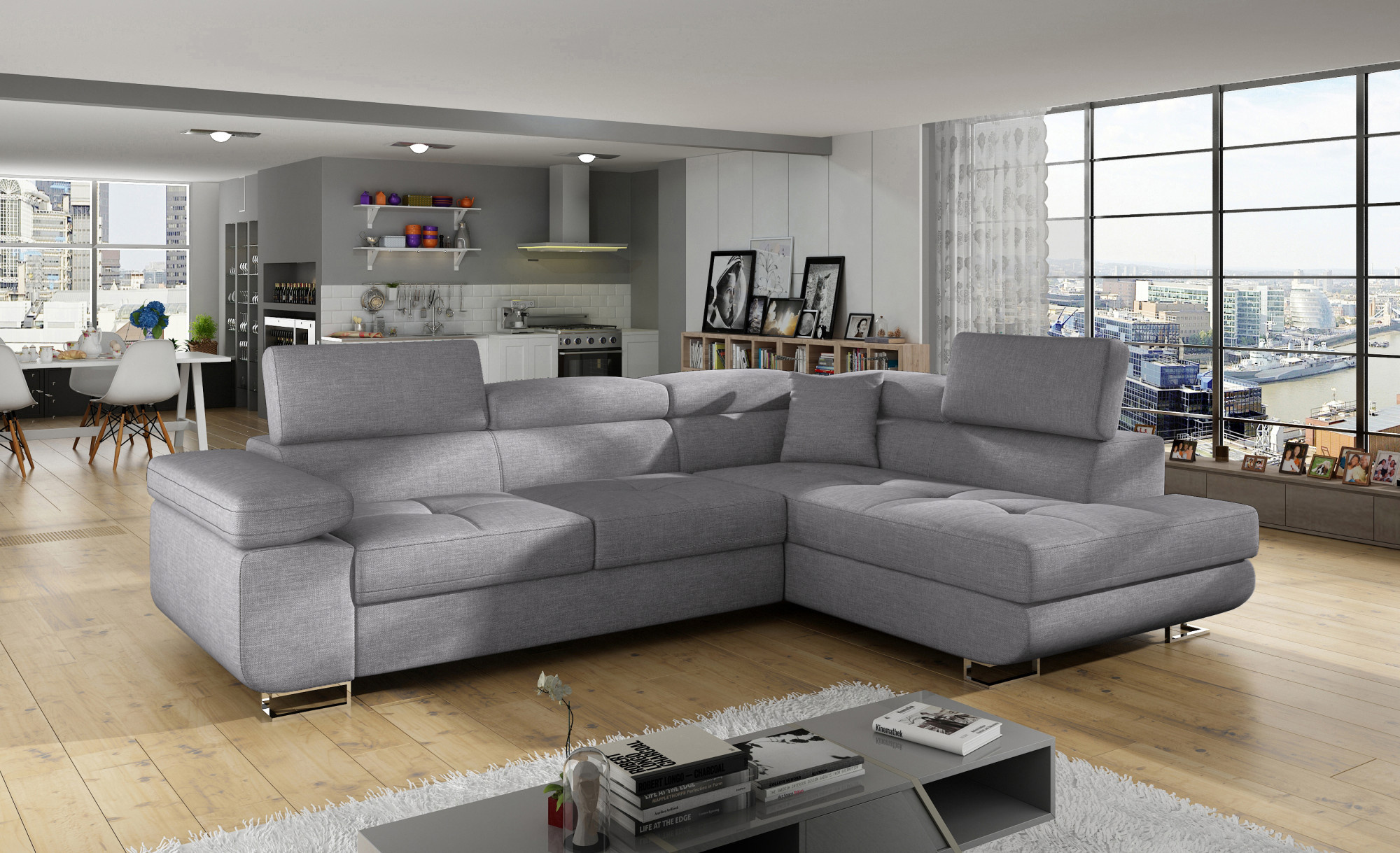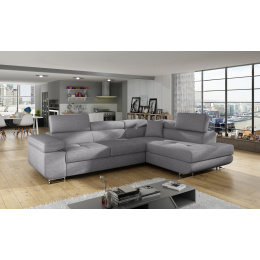 Rohová sedacia súprava ATOS je vyrobená z kvalitných materiálov.Konštrukcia pohovky je vyrobená z kombinácie dreva a drevotriesky. Sedacia časť je vyrobená z kombinácie polyuretánovej peny T3040+T2542 a vlnitých pružín. Na podopretie pohovky sa používa polyuretánová pena T2542/T3040.Sedacia súprava je rozkladacia pomocou rozkladacieho typu Dolphin. Pohovka má priestranný úložný priestor na uloženie posteľnej bielizne.