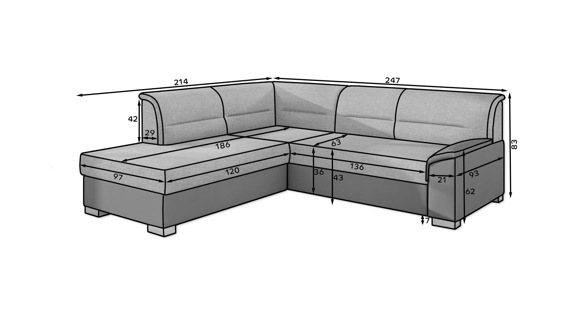 Rohová sedacia súprava Bergen je vyrobená z kvalitných materiálov.Konštrukcia pohovky je vyrobená z kombinácie dreva a drevotriesky. Sedacia časť je vyrobená v kombinácii polyuretánovej peny T3040 a pružín. Pohovka je skladacia pomocou skladacieho stroja. Pohovka má priestranný úložný priestor na uloženie posteľnej bielizne.
