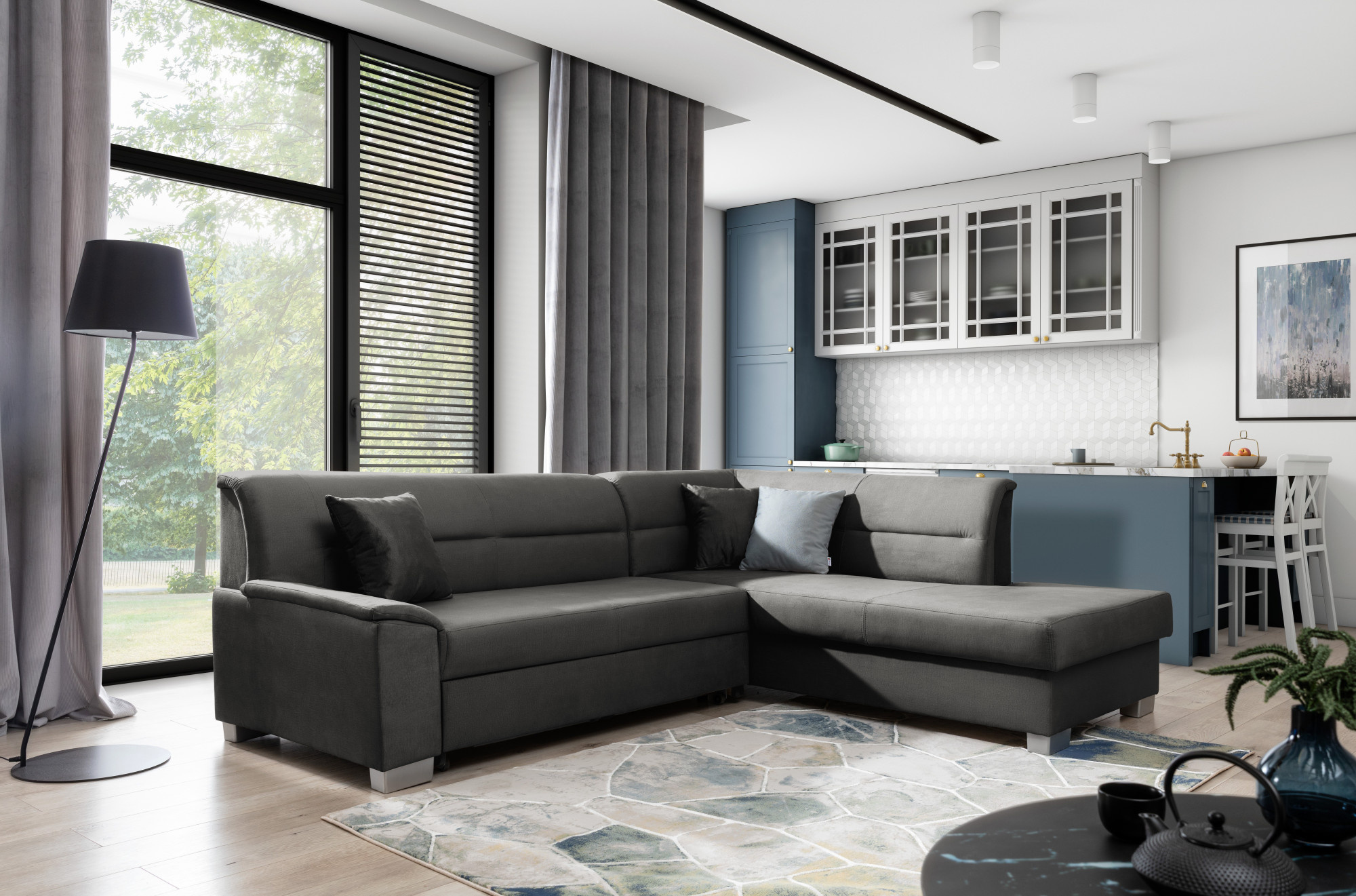- možnosť prispôsobenia sedacej súpravy priestoru - zadná časť sedacej súpravy je čalúnená rovnakou poťahovou látkou