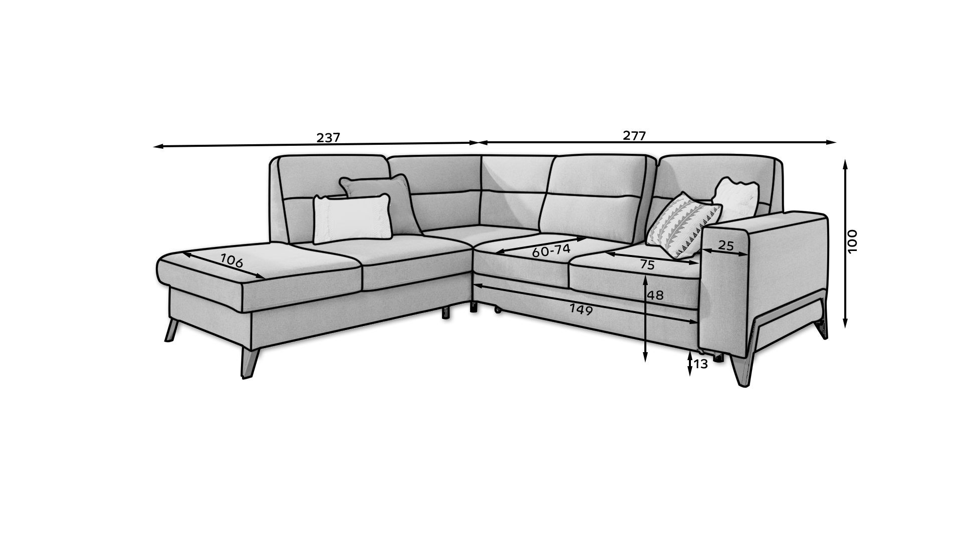 Rohová sedacia súprava Cassara je vyrobená z kvalitných materiálov.Konštrukcia pohovky je vyrobená z kombinácie dreva. Sedacia časť je vyrobená z kombinácie polyuretánovej peny T2315 + pamäťovej peny HR 3035 a vlnitých pružín typu B. Sedacia súprava je rozkladacia pomocou rozkladacieho mechanizmu Dolphin.