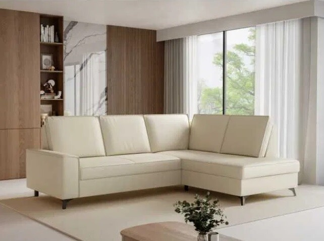Rohová sedacia súprava s funkciou spania a skrinkou na lôžkoviny, vyrobená z vlnitej pružiny. Sedadlo je vyplnené HR penou s vysokou elasticitou.