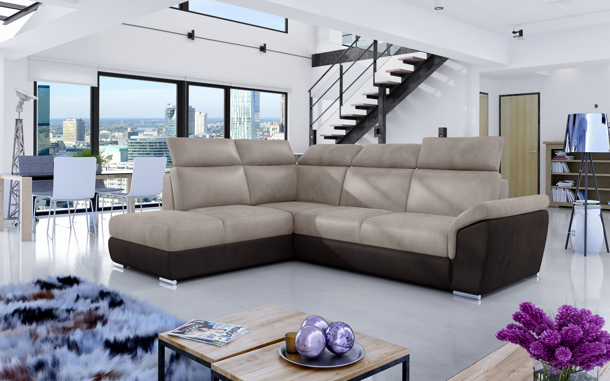 Rohová sedacia súprava Loreto je vyrobená z kvalitných materiálov.Konštrukcia pohovky je vyrobená z kombinácie dreva a drevotriesky. Sedacia časť je vyrobená z kombinácie polyuretánovej peny T30 a kostí. Na podopretie pohovky sa používa polyuretánová pena T2542.Sedacia súprava je rozkladacia pomocou rozkladacieho typu Dolphin. Pohovka má priestranný úložný priestor na uloženie posteľnej bielizne.