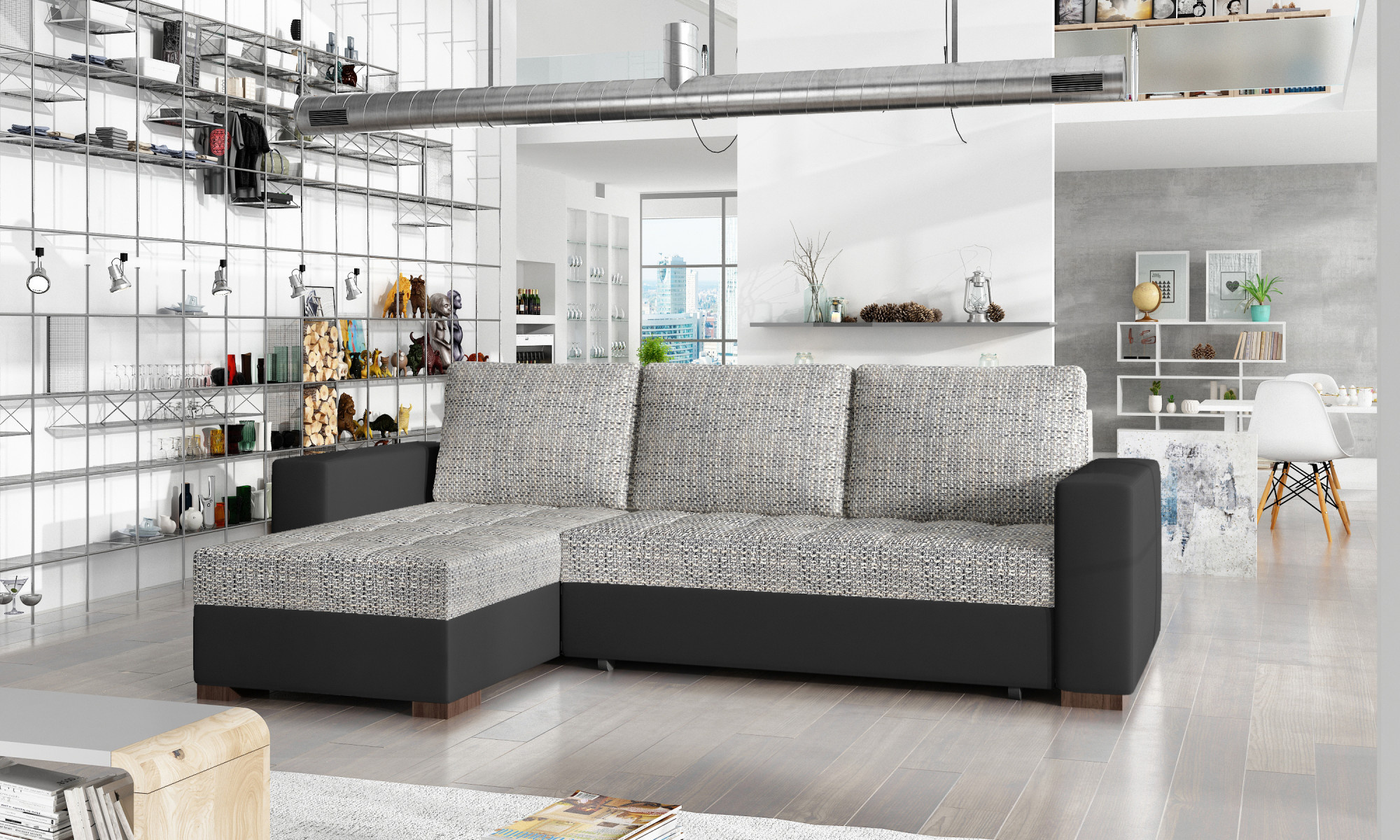 Rohová sedacia súprava Newark je vyrobená z kvalitných materiálov.Konštrukcia pohovky je vyrobená z kombinácie dreva a drevotriesky. Sedacia časť je vyrobená z kombinácie polyuretánovej peny T3040 + T2542 a pružín.Sedacia súprava je rozkladacia pomocou systému DL Automatic. Pohovka má priestranný úložný priestor na uloženie posteľnej bielizne.