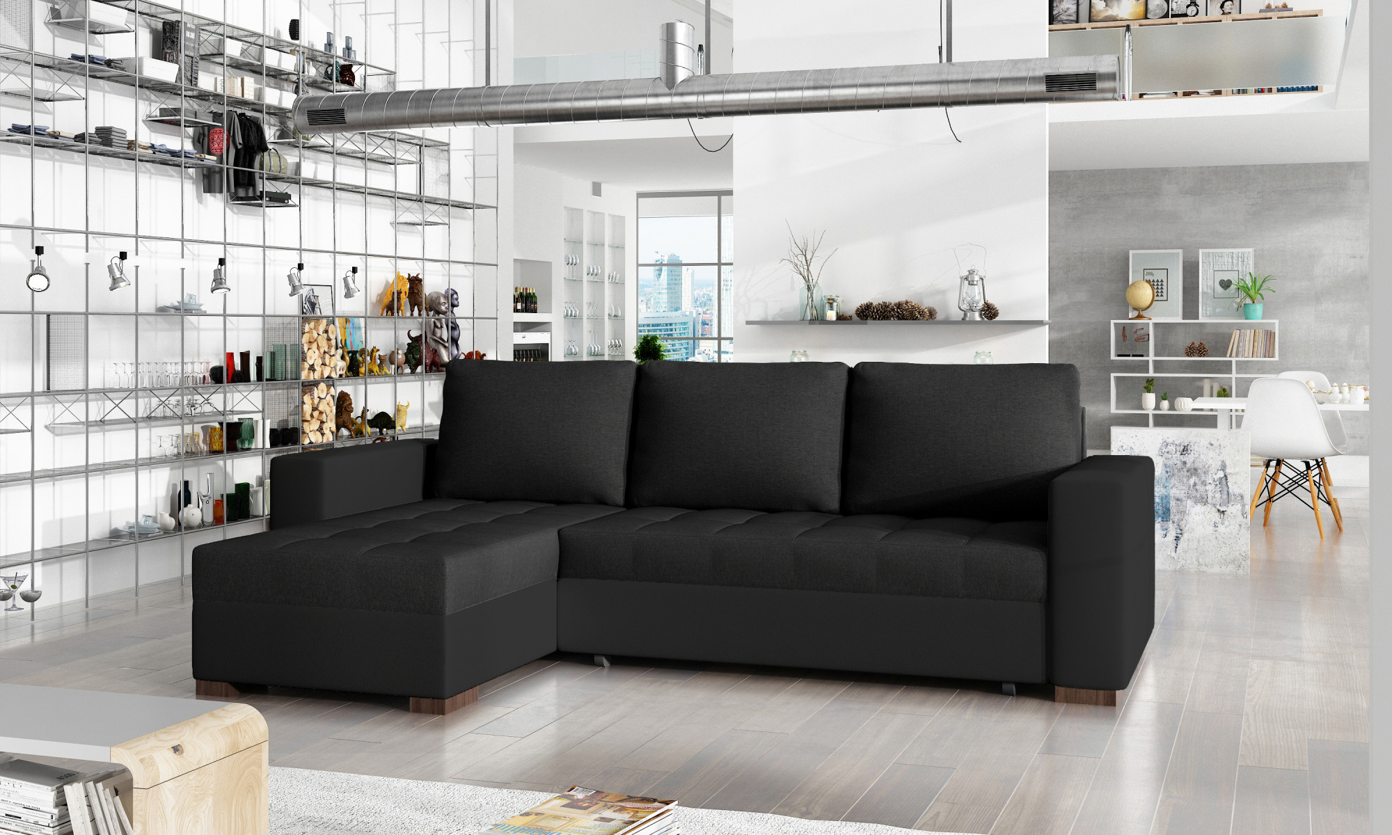Rohová sedacia súprava Newark je vyrobená z kvalitných materiálov.Konštrukcia pohovky je vyrobená z kombinácie dreva a drevotriesky. Sedacia časť je vyrobená z kombinácie polyuretánovej peny T3040 + T2542 a pružín.Sedacia súprava je rozkladacia pomocou systému DL Automatic. Pohovka má priestranný úložný priestor na uloženie posteľnej bielizne.