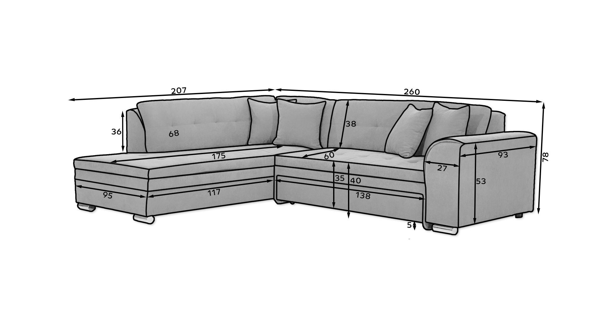 Rohová sedacia súprava Pieretta je vyrobená z kvalitných materiálov.Konštrukcia sedacej súpravy je vyrobená z dreva. Sedacia časť je vyrobená v kombinácii polyuretánovej peny T3030 a vlnitých pružín. Sedacia súprava je rozkladacia pomocou rozkladacieho mechanizmu typu Delfín.