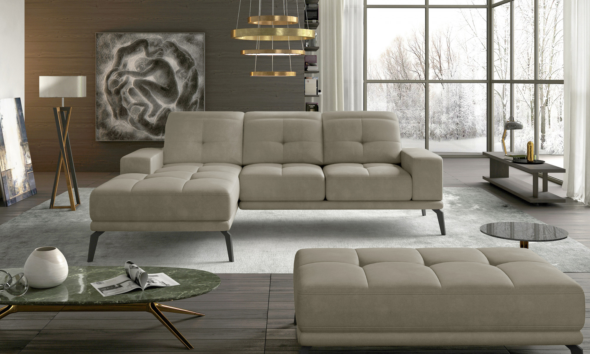 Rohová sedacia súprava Torrense je vyrobená z kvalitných materiálov.Konštrukcia pohovky je vyrobená z kombinácie dreva a drevotriesky. Sedacia časť je vyrobená z kombinácie HR peny a kostí.Pohovka nie je rozkladacia. S taburetkou môžete vytvoriť plochu na spanie s rozmermi 215 x 140 cm.