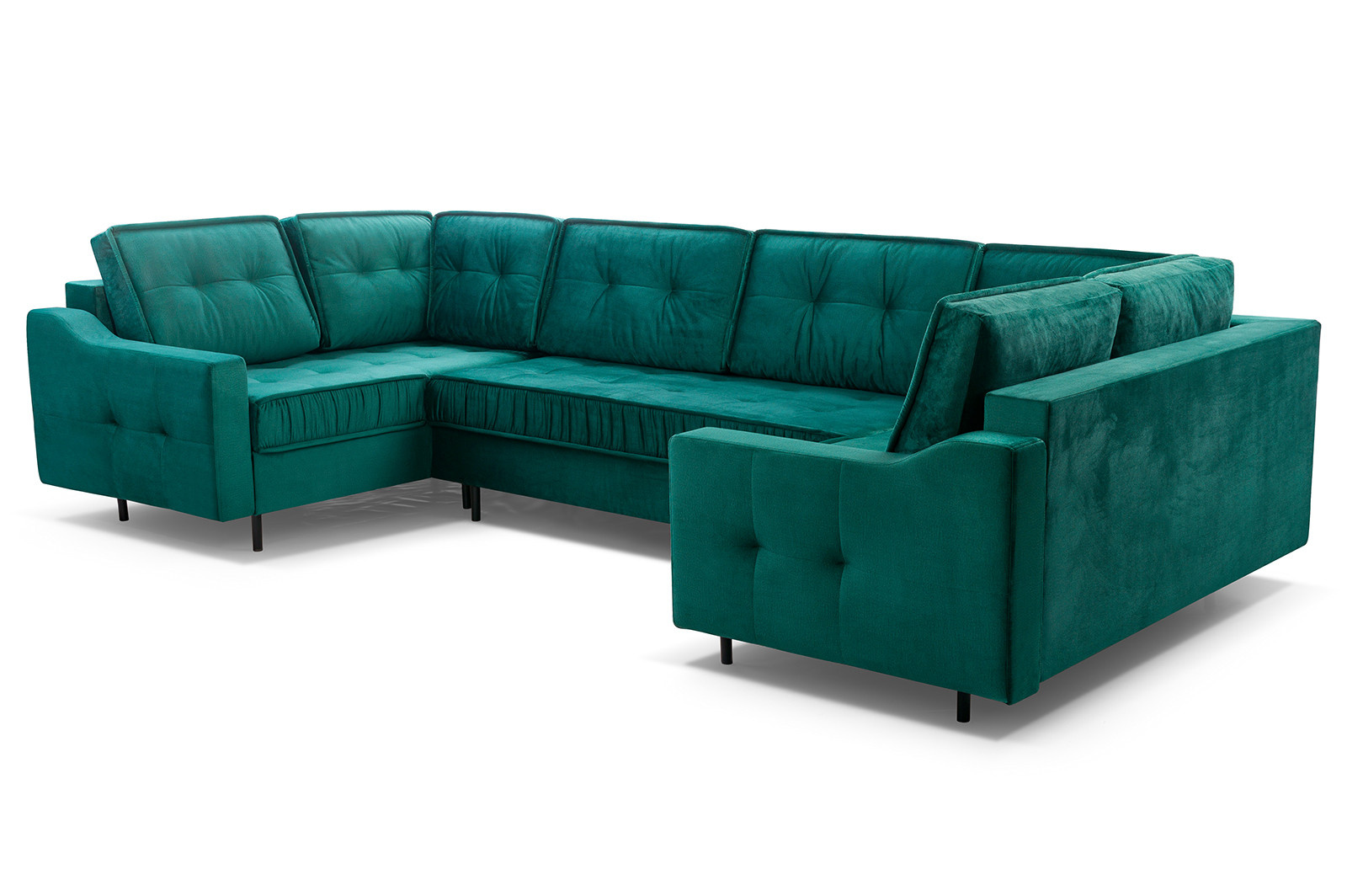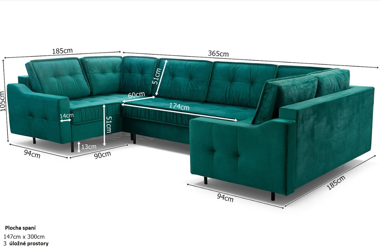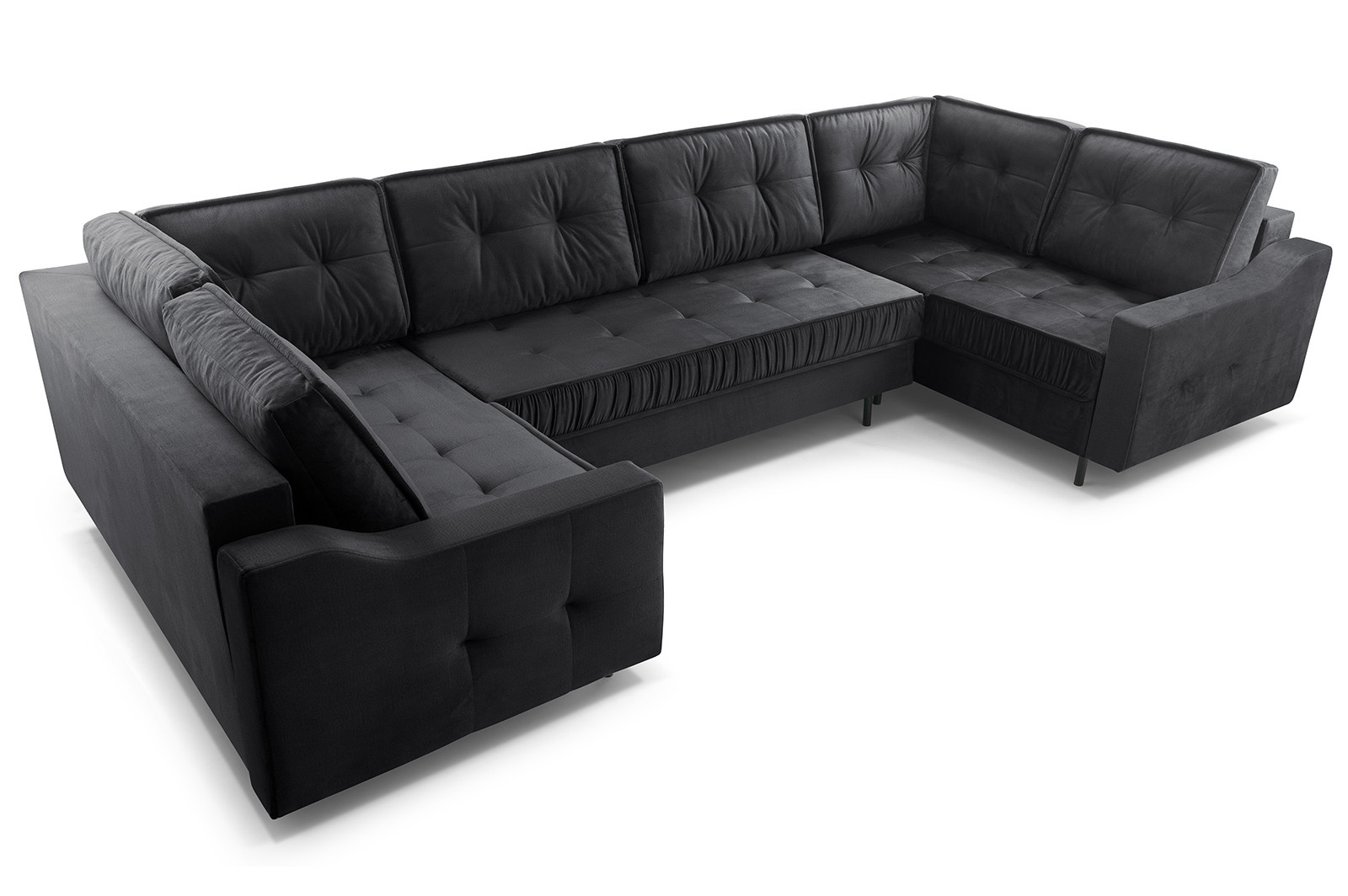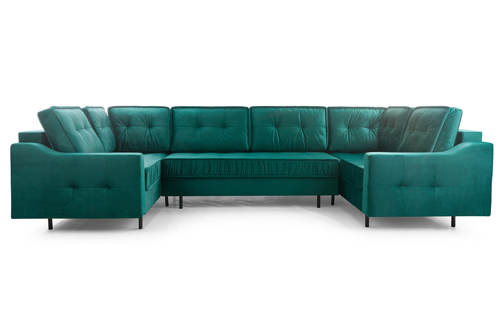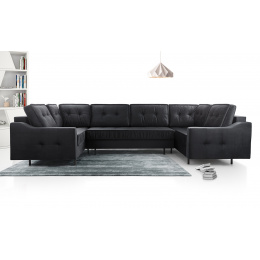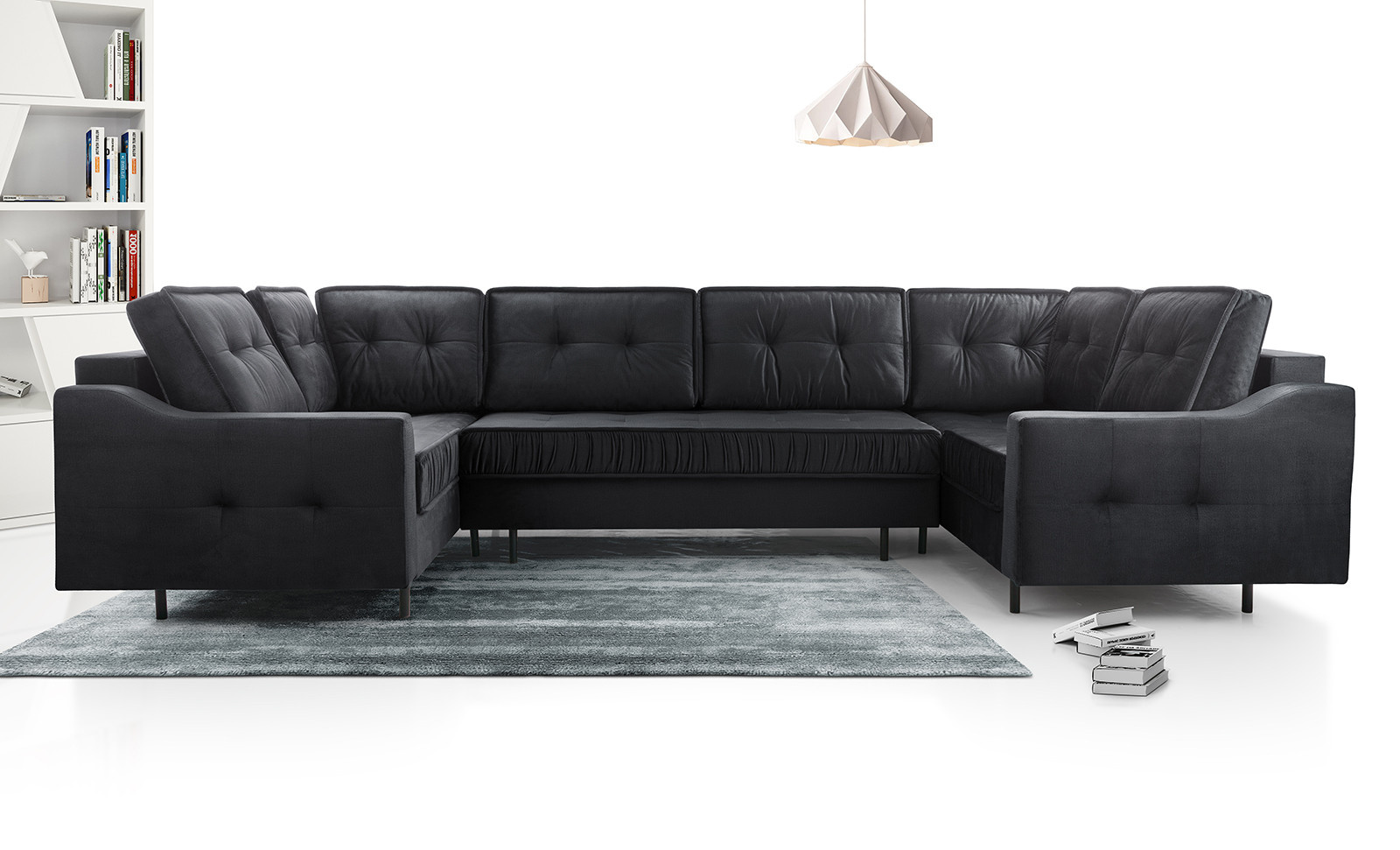 Rohová pohovka AKITA U je elegantná pohovka v tvare U s pomerne univerzálnym tvarom, takže ju možno bez väčších problémov umiestniť k stene alebo do stredu miestnosti - je to samostatne stojaci kus nábytku s čalúneným operadlom. Pohovka s rozkladacou rohovou sedačkou je vybavená tromi úložnými priestormi a má funkciu spania. Pevnú a odolnú konštrukciu tvorí drevený rám a priestor pod čalúnením je zakončený vlnitou pružinou a čalúnnickou penou, vďaka čomu na nábytku nezostávajú nevzhľadné preliačiny ani deformácie. Ozdobné čierne nožičky sú akcentom, ktorý dodáva nábytku originalitu a ľahkosť. Rohová pohovka pre viac osôb je kus nábytku kompletne čalúnený kvalitnou látkou, ktorej farbu si môžete vybrať. Rohová sedacia súprava AKITA U s bočnicami v základnom vyhotovení. Pohovka môže byť umiestnená uprostred miestnosti.