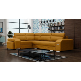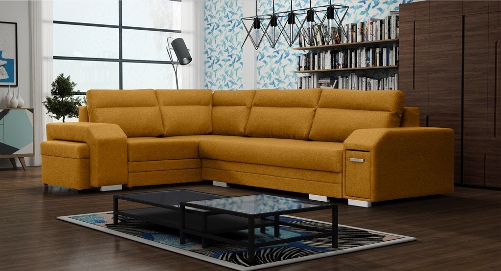 ALVARES je elegantná rohová pohovka v tvare písmena L s bočnicami, ktorá upúta pozornosť chrómovými nožičkami a úchytkami v kombinácii s praktickým úložným priestorom na drobné doplnky. Stabilná drevená rámová konštrukcia je k dispozícii v pravostrannej alebo ľavostrannej verzii, takže každý zákazník si môže prezentovaný model prispôsobiť svojim individuálnym preferenciám a priestorovým možnostiam. Rozkladacia rohová pohovka je vybavená funkciou automatického rozkladu, ktorá vám umožní efektívne nahliadnuť do dvoch úložných priestorov na posteľnú bielizeň a rozložiť rohovú pohovku. Zaujímavým prvkom je zabudovaný priestor pre taburet v rohu, ktorý je súčasťou súpravy, ako aj ozdobné vankúše umiestnené na mierne tvarovanom operadle. Štýlová rohová pohovka ALVARES s funkciou spania je vyplnená vlnitými pružinami a čalúnnickou penou T-30, ktoré zabezpečujú dostatočnú odolnosť a pružnosť sedáku alebo operadla. Predstavená rohová pohovka je celá čalúnená pôsobivou látkou, ktorá je k dispozícii v širokej škále farieb.