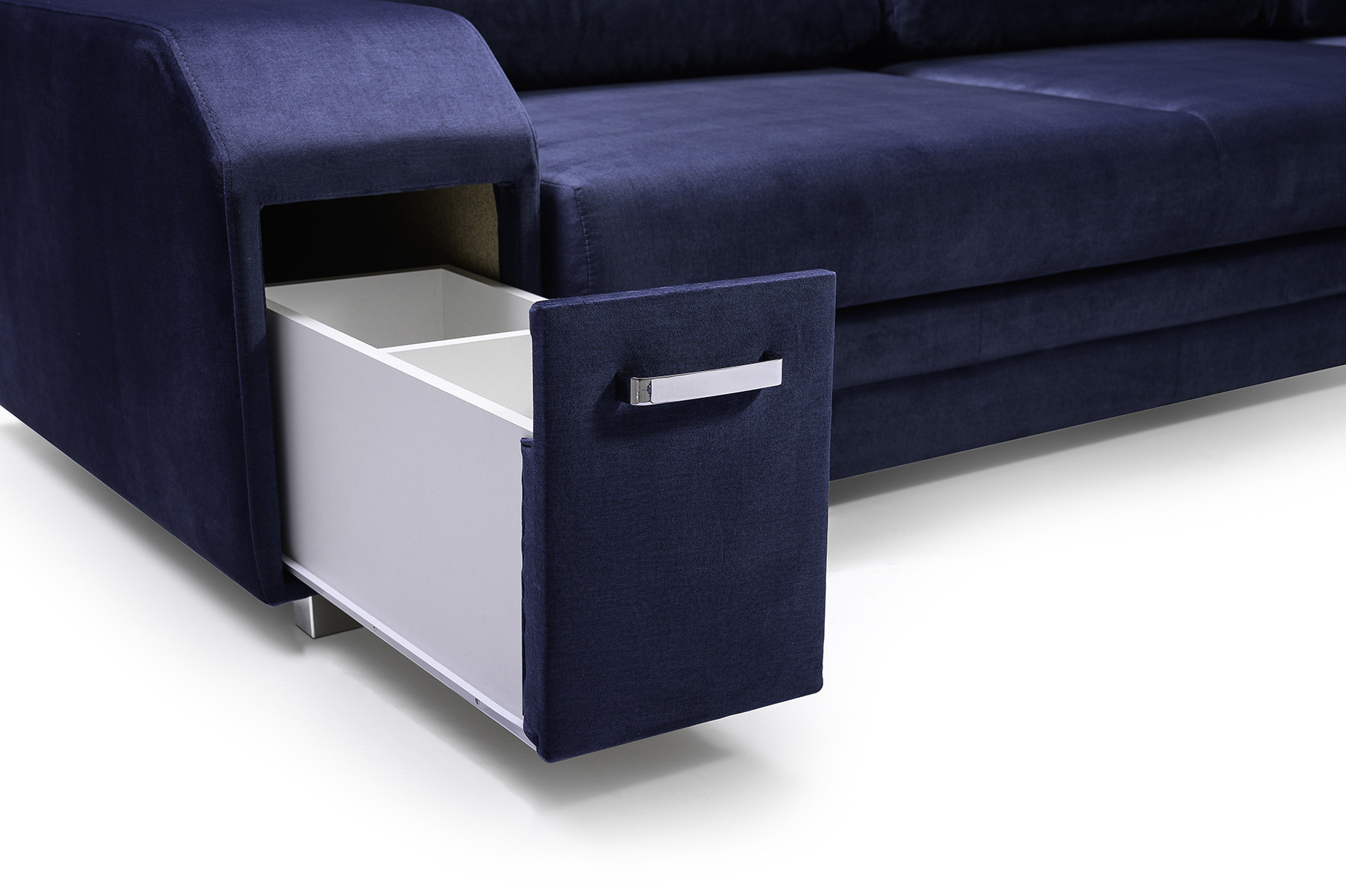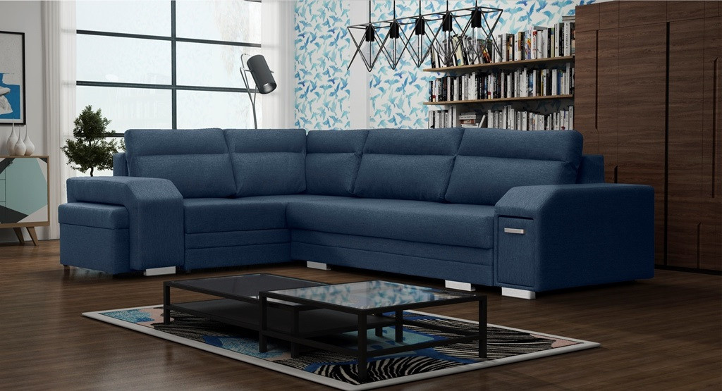 ALVARES je elegantná rohová pohovka v tvare písmena L s bočnicami, ktorá upúta pozornosť chrómovými nožičkami a úchytkami v kombinácii s praktickým úložným priestorom na drobné doplnky. Stabilná drevená rámová konštrukcia je k dispozícii v pravostrannej alebo ľavostrannej verzii, takže každý zákazník si môže prezentovaný model prispôsobiť svojim individuálnym preferenciám a priestorovým možnostiam. Rozkladacia rohová pohovka je vybavená funkciou automatického rozkladu, ktorá vám umožní efektívne nahliadnuť do dvoch úložných priestorov na posteľnú bielizeň a rozložiť rohovú pohovku. Zaujímavým prvkom je zabudovaný priestor pre taburet v rohu, ktorý je súčasťou súpravy, ako aj ozdobné vankúše umiestnené na mierne tvarovanom operadle. Štýlová rohová pohovka ALVARES s funkciou spania je vyplnená vlnitými pružinami a čalúnnickou penou T-30, ktoré zabezpečujú dostatočnú odolnosť a pružnosť sedáku alebo operadla. Predstavená rohová pohovka je celá čalúnená pôsobivou látkou, ktorá je k dispozícii v širokej škále farieb.