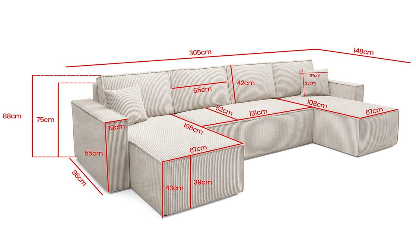 So šírkou 305 cm, maximálnou výškou 88 cm a hĺbkou 148 cm ponúka táto sedacia súprava dostatok priestoru pre pohodlné sedenie aj ležanie. Výška sedu je nastavená na príjemných 43 cm, čo zaisťuje optimálny komfort pre každodenné používanie. Vďaka týmto rozmerom sa sedacia súprava ľahko zmestí do väčšiny obývacích izieb, bez toho aby pôsobila príliš masívne.