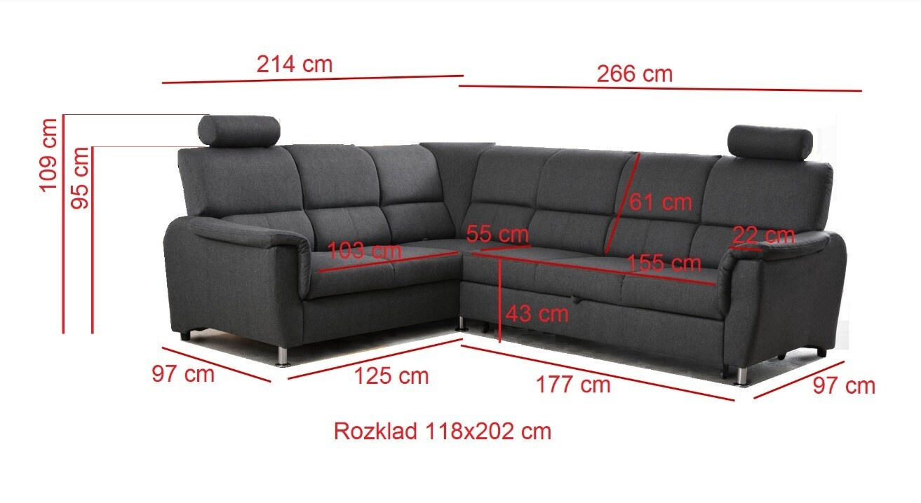 Jej rozmery sú šírka 266 cm, hĺbka 216 cm a maximálna výška 109 cm. Sedacia časť má minimálnu výšku 44 cm, čo zaisťuje optimálne pohodlie pri sedení.Tento model je vyrobený z kvalitných materiálov, ktoré zaručujú jeho dlhú životnosť a odolnosť.