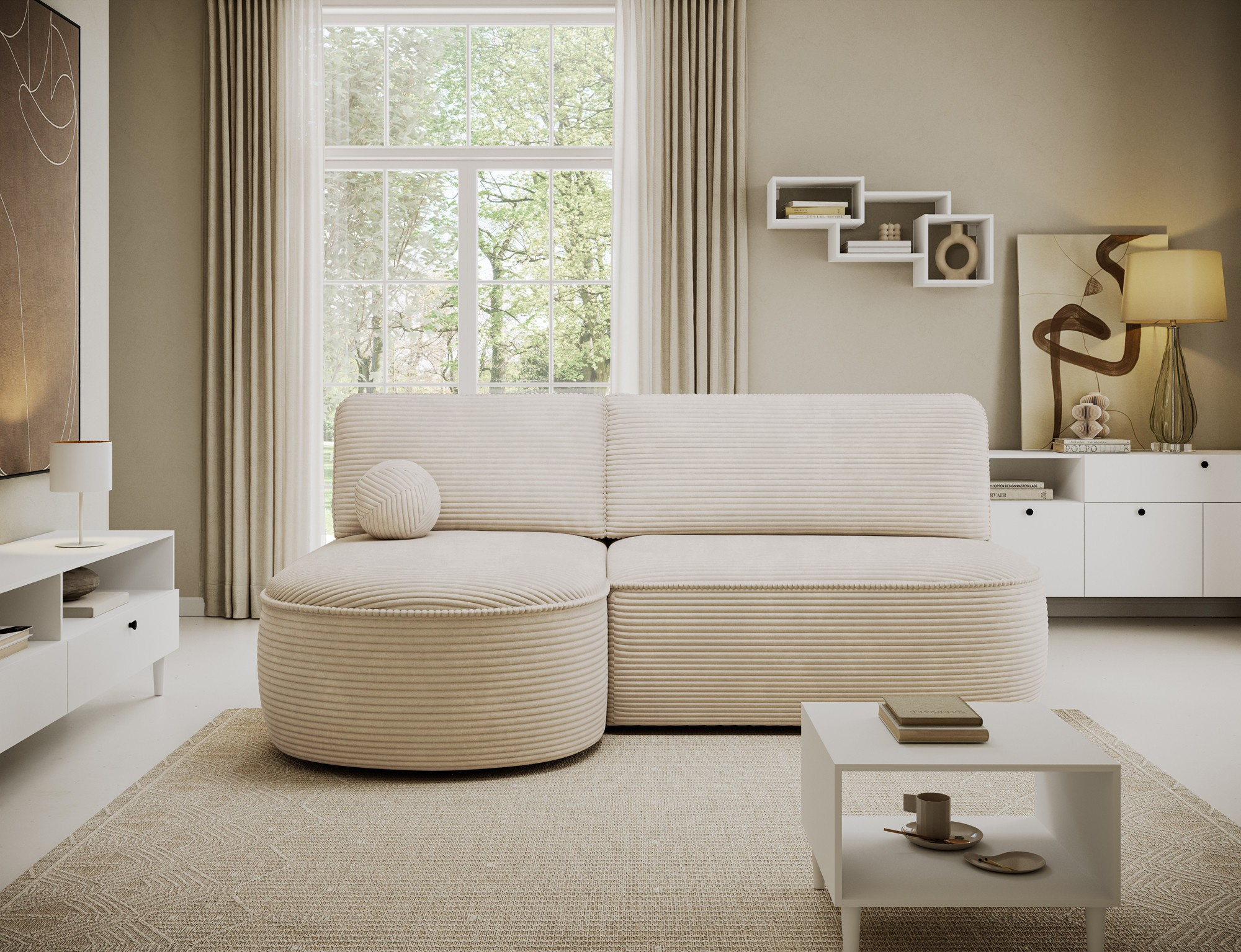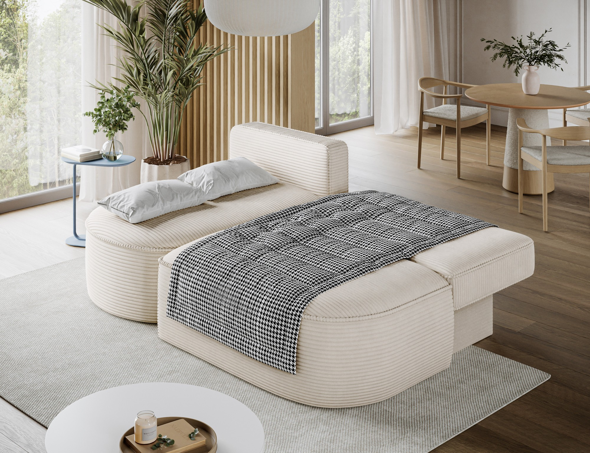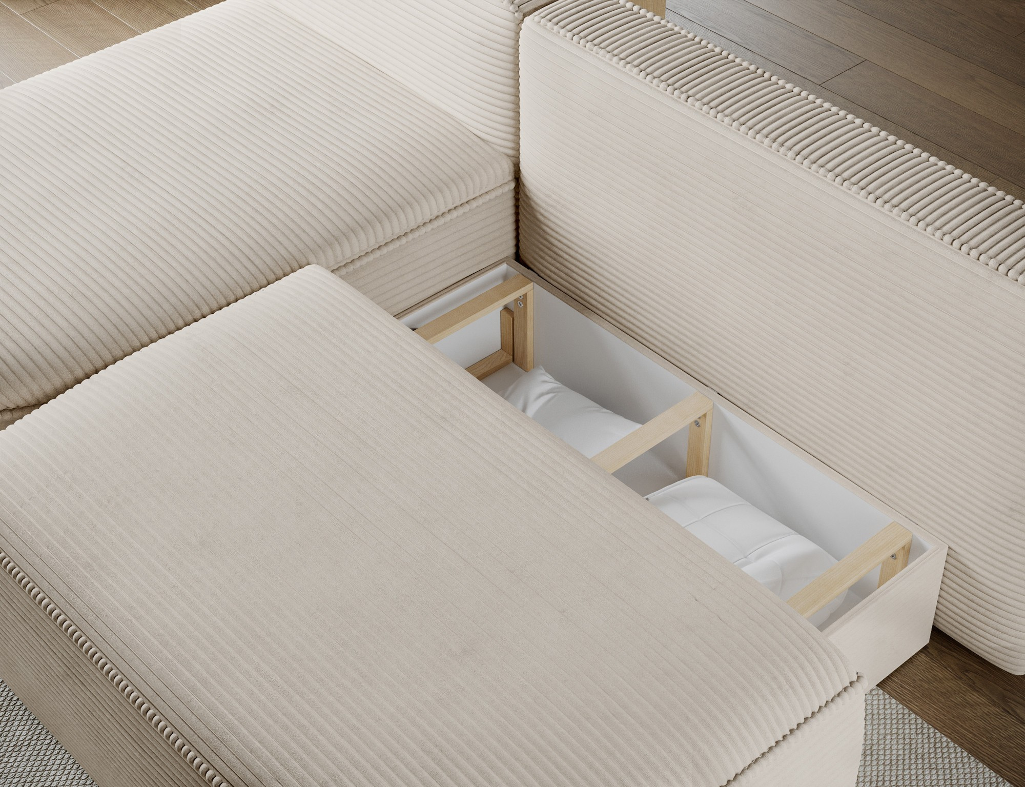 Ďalšou praktickou vlastnosťou je úložný priestor, ktorý je diskrétne integrovaný do konštrukcie súpravy. Tento priestor je ideálny na uskladnenie posteľnej bielizne, vankúšov alebo ďalších predmetov, ktoré chcete mať po ruke, ale zároveň ich mať úhľadne upratané.
