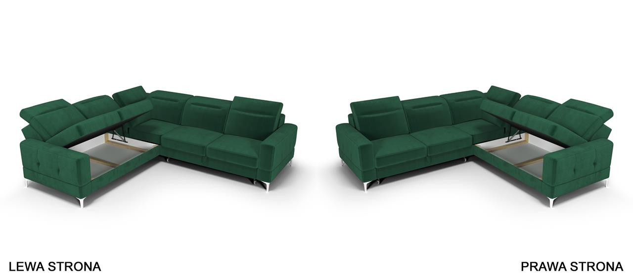 Rohová sedačka má nastaviteľné, viacstupňové opierky hlavy, chrómované ozdobné nožičky, sedáky s ozdobným prešívaním, ktoré sú vyrobené na vlnitých pružinách a vysoko elastickej pene, čo zaisťuje vysoký komfort používania a zabraňuje deformácii najčastejšie používaných plôch. Stranu rohovej sedačky určuje úložný priestor na posteľnú bielizeň. Kontajner vpravo - pravá strana, kontajner vľavo - ľavá strana (stojac čelom k nábytku).
