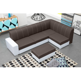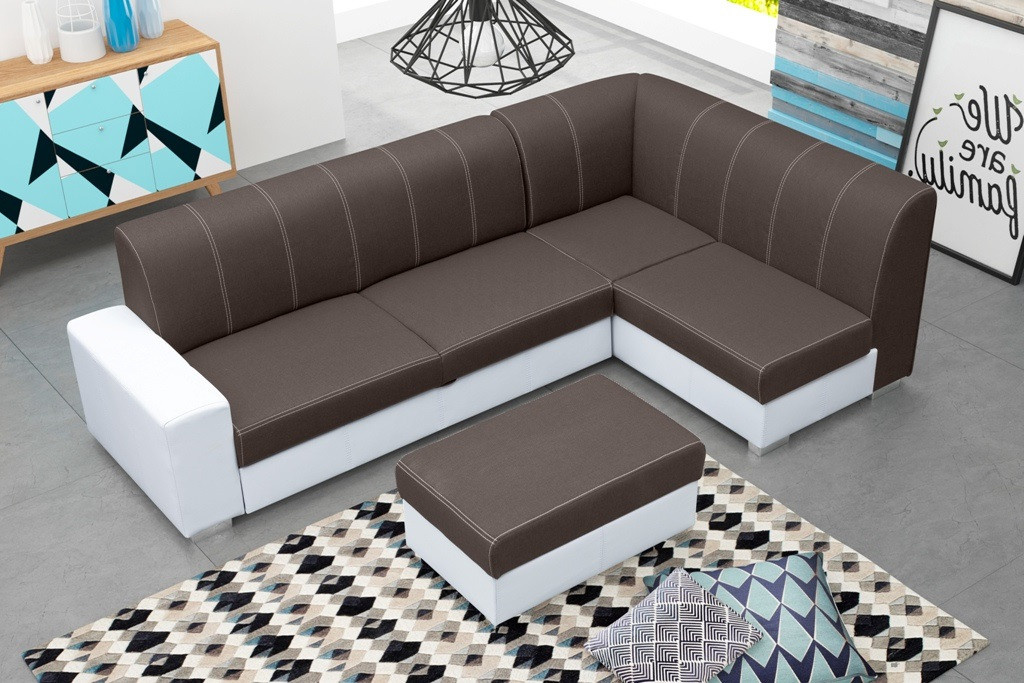 Elegantná rohová pohovka s taburetom bude vyzerať skvele v modernej obývacej izbe. Rohová pohovka s jednou stranou je k dispozícii v tvare L, takže si môžete vybrať pravú alebo ľavú verziu. Nábytok je umiestnený na drevenom ráme, ktorý zabezpečuje dostatočnú odolnosť, pevnosť a stabilitu konštrukcie. Originálny dizajn nábytku dopĺňajú chrómové nožičky. Farebnú schému môžete vybrať z dostupných vzorkovníkov farieb. Rohová sedacia súprava je vybavená priestranným kontajnerom na lôžkoviny a funkciou na spanie, vďaka ktorej sa dá rohová sedacia súprava rozložiť. Rohová pohovka pre viac osôb je voľne stojaci kus nábytku - vďaka čalúnenému operadlu ju možno voľne umiestniť do centrálnej časti obývacej izby. Výplň rohovej sedacej súpravy tvorí vlnitá pružina a čalúnnická pena; použité materiály zabezpečujú správnu pružnosť, takže na rohovej sedacej súprave nevznikajú nevzhľadné preliačiny. Štýlová rohová pohovka s ozdobným prešívaním na mierne tvarovanom operadle zaručí nielen pohodlie pri odpočinku, ale bude aj ozdobou modernej obývačky.