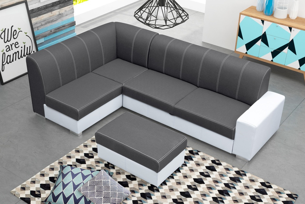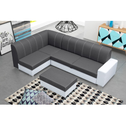 Elegantná rohová pohovka s taburetom bude vyzerať skvele v modernej obývacej izbe. Rohová pohovka s jednou stranou je k dispozícii v tvare L, takže si môžete vybrať pravú alebo ľavú verziu. Nábytok je umiestnený na drevenom ráme, ktorý zabezpečuje dostatočnú odolnosť, pevnosť a stabilitu konštrukcie. Originálny dizajn nábytku dopĺňajú chrómové nožičky. Farebnú schému môžete vybrať z dostupných vzorkovníkov farieb. Rohová sedacia súprava je vybavená priestranným kontajnerom na lôžkoviny a funkciou na spanie, vďaka ktorej sa dá rohová sedacia súprava rozložiť. Rohová pohovka pre viac osôb je voľne stojaci kus nábytku - vďaka čalúnenému operadlu ju možno voľne umiestniť do centrálnej časti obývacej izby. Výplň rohovej sedacej súpravy tvorí vlnitá pružina a čalúnnická pena; použité materiály zabezpečujú správnu pružnosť, takže na rohovej sedacej súprave nevznikajú nevzhľadné preliačiny. Štýlová rohová pohovka s ozdobným prešívaním na mierne tvarovanom operadle zaručí nielen pohodlie pri odpočinku, ale bude aj ozdobou modernej obývačky.