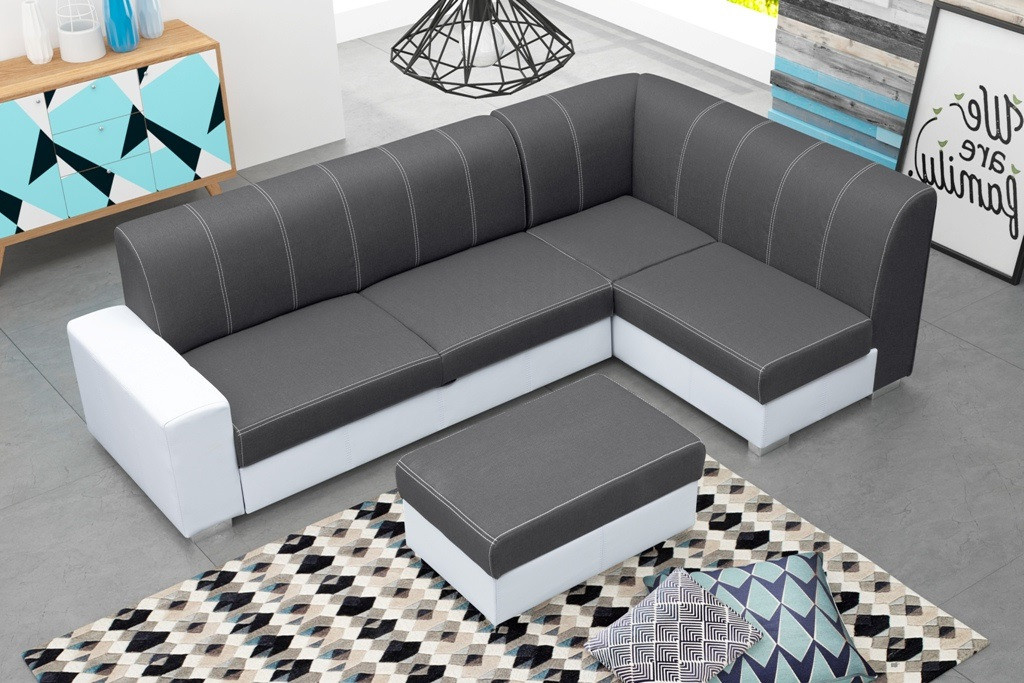 Elegantná rohová pohovka s taburetom bude vyzerať skvele v modernej obývacej izbe. Rohová pohovka s jednou stranou je k dispozícii v tvare L, takže si môžete vybrať pravú alebo ľavú verziu. Nábytok je umiestnený na drevenom ráme, ktorý zabezpečuje dostatočnú odolnosť, pevnosť a stabilitu konštrukcie. Originálny dizajn nábytku dopĺňajú chrómové nožičky. Farebnú schému môžete vybrať z dostupných vzorkovníkov farieb. Rohová sedacia súprava je vybavená priestranným kontajnerom na lôžkoviny a funkciou na spanie, vďaka ktorej sa dá rohová sedacia súprava rozložiť. Rohová pohovka pre viac osôb je voľne stojaci kus nábytku - vďaka čalúnenému operadlu ju možno voľne umiestniť do centrálnej časti obývacej izby. Výplň rohovej sedacej súpravy tvorí vlnitá pružina a čalúnnická pena; použité materiály zabezpečujú správnu pružnosť, takže na rohovej sedacej súprave nevznikajú nevzhľadné preliačiny. Štýlová rohová pohovka s ozdobným prešívaním na mierne tvarovanom operadle zaručí nielen pohodlie pri odpočinku, ale bude aj ozdobou modernej obývačky.