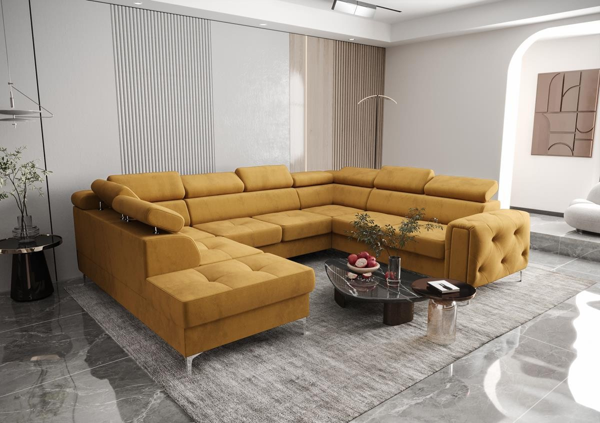 Kolekcia čalúneného nábytku Orion je niečo, čo nikde inde nenájdete! Charakteristickým prvkom sú krásne zdobené, prešívané boky v štýle glamour. Okrem estetických prvkov stojí za to venovať pozornosť dokončeniu v podobe nastaviteľných opierok hlavy, ktoré uľahčia prispôsobenie výšky operadla tak, aby bola pre vás ideálna. Vysoké 13 cm kovové nohy podčiarkujú celok a dodávajú konštrukcii ľahkosť.