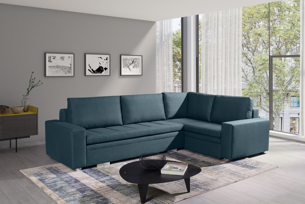 Moderná rohová sedacia súprava TIA je určená pre viac ako jednu osobu a je vybavená až dvoma kontajnermi na posteľnú bielizeň, do ktorých môžete bez väčších problémov uložiť vankúše, prikrývky a periny. Rohová pohovka v tvare písmena L je k dispozícii v pravom alebo ľavom prevedení. Štýlová rohová pohovka s funkciou spania je vybavená aj automatickým rozkladom, vďaka ktorému sa nábytok dá rýchlo a efektívne rozložiť. Rohová sedacia súprava pre viac osôb s bočnicami je vyplnená vlnitou pružinou na ploche na spanie, sedáku a operadle a tiež čalúnnickou penou T-30. Voľne stojaca rohová sedacia súprava je umiestnená na ozdobných chrómových nožičkách, ktoré podčiarkujú modernistické usporiadanie nábytku. Odolný a stabilný kus nábytku s dreveným rámom má čalúnenú zadnú časť, vďaka čomu ho možno umiestniť nielen k stene, ale aj do centrálnej časti miestnosti. Rohová rozkladacia pohovka TIA do obývačky môže byť čalúnená rôznymi látkami.