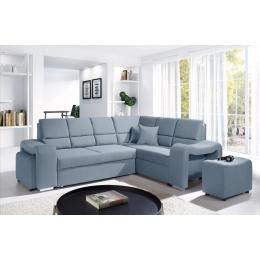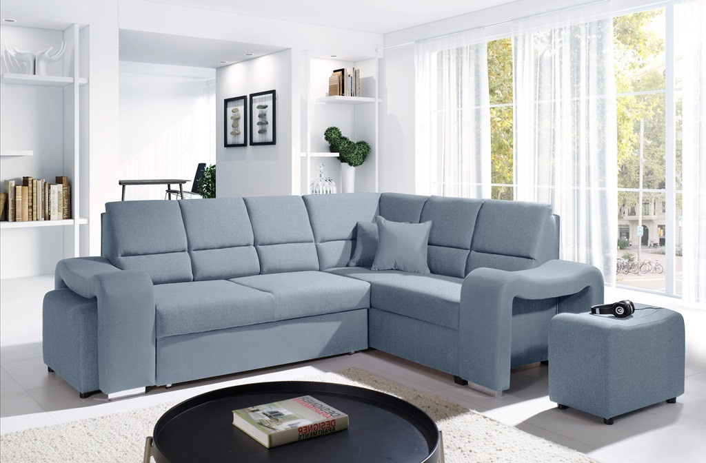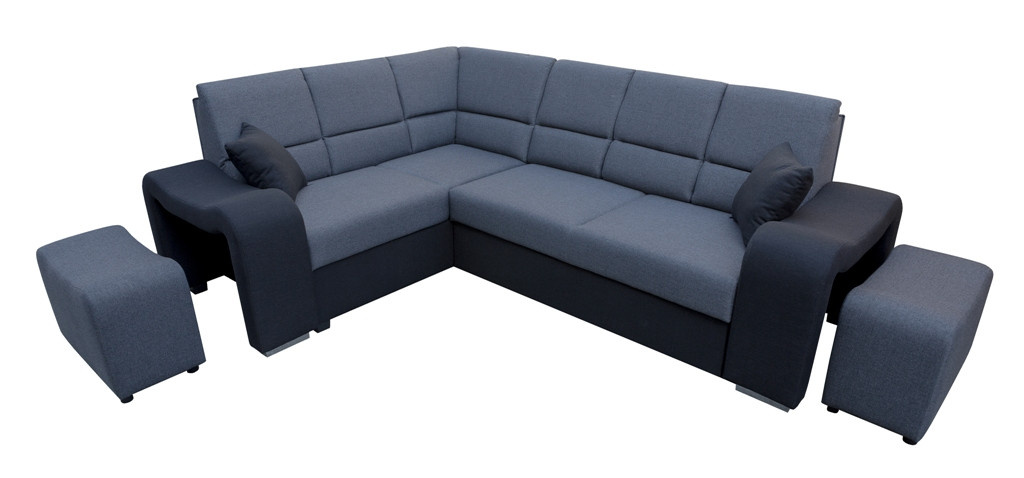 Rohová sedacia súprava WAKIKI má štýlový dizajn, ktorý zabezpečí pohodlie aj pri niekoľkohodinovom relaxovaní s rodinou alebo priateľmi. Táto moderná rohová pohovka v tvare písmena L je k dispozícii v pravej aj ľavej verzii. Predvádzaná rohová pohovka pre viac osôb s funkciou spania umožňuje rozložiť nábytok, čím sa zabezpečí pohodlie a bezpečnosť spánku. WAKIKI je k dispozícii v širokej škále farieb, takže si každý môže vytvoriť model podľa svojho individuálneho vkusu a preferencií. Moderná rohová pohovka do obývačky je doplnená dvoma taburetkami, ktoré vytvárajú ďalšie miesto na sedenie a sú vhodné aj ako podnožka. Do nábytku boli zabudované špeciálne úložné priestory pre vyššie uvedené stoličky, kde ich možno voľne uložiť, keď sa nepoužívajú. Nábytok stojí na drevenom ráme s chrómovými nohami, ktoré mu dodávajú moderný vzhľad. Voľne stojaca rohová sedacia súprava WAKIKI má aj úložný priestor na posteľnú bielizeň, do ktorého sa ľahko zmestia prikrývky, vankúše alebo deky.