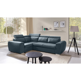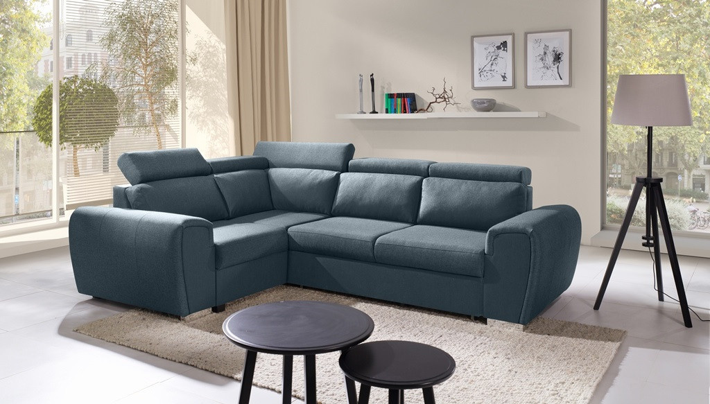 Moderná rohová pohovka WIZARO má elegantný dizajn, ktorý sa dokonale hodí do obývacej izby alebo obývačky zariadenej v industriálnej a modernistickej estetike. Rohová pohovka v tvare L s bočnicami je k dispozícii v dvoch verziách: pravej alebo ľavej. Rohová pohovka s mierne zaoblenými hranami je vybavená pohyblivými opierkami hlavy, takže si každý môže nastaviť operadlo podľa svojich individuálnych potrieb a pohodlia. Rohová súprava pre viac osôb sa dodáva s ozdobnými vankúšmi. Okrem polohovateľného operadla má rohová pohovka úložný priestor na lôžkoviny a tiež funkciu spania, takže ju možno rozložiť a zabezpečiť tak pohodlný a bezpečný nočný odpočinok pre pozvaných hostí. Rohová pohovka s dreveným rámom je vyplnená čalúnnickou penou T-30 a vlnitou pružinou na sedacej časti. Uvedené materiály zabezpečujú odolnosť, stabilitu a pevnosť konštrukcie. Štýlová rohová pohovka s chrómovými nožičkami bude nielen miestom pohodlného odpočinku, ale aj estetickým kusom nábytku, ktorý zvýrazní vytvorené usporiadanie.