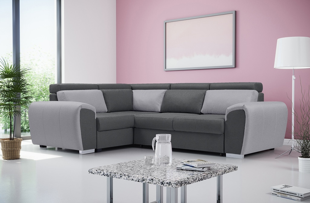 Dvojfarebná rohová sedacia súprava WYZ má vysoko estetický dizajn s jemne zaoblenými tvarmi, ktorý dokonale zapadne do priestoru obývačky alebo modernej obývačky. Rohová pohovka s bočnicami je podopretá chrómovými nožičkami, ktoré nielenže dodávajú nábytku štýlový charakter, ale zabezpečujú aj primeranú stabilitu a odolnosť. Rohová pohovka WYZ v tvare písmena L je k dispozícii v pravom alebo ľavom prevedení. Rohová pohovka s bočnicami je vybavená nádobou na lôžkoviny, funkciou spania a automatickým rozkladom typu delfín. Rohová pohovka je čalúnená látkou a je k dispozícii v širokej škále farieb, aby vyhovovala individuálnym preferenciám každého. Sedačka WYZ je vybavená nastaviteľnými opierkami hlavy a ozdobnými vankúšmi, ktoré zabezpečia pohodlie aj pri niekoľkohodinovom sedení s knihou v ruke alebo pri sledovaní televízie. Drevený rám je vyplnený vlnitými pružinami a čalúnnickou penou, ktoré udržiavajú zvýšenú pružnosť, aby sa nábytok nedeformoval. Moderné rohové sedacie súpravy sa vyrábajú na zákazku, takže si môžete vybrať farbu vložiek a celkové farebné riešenie.