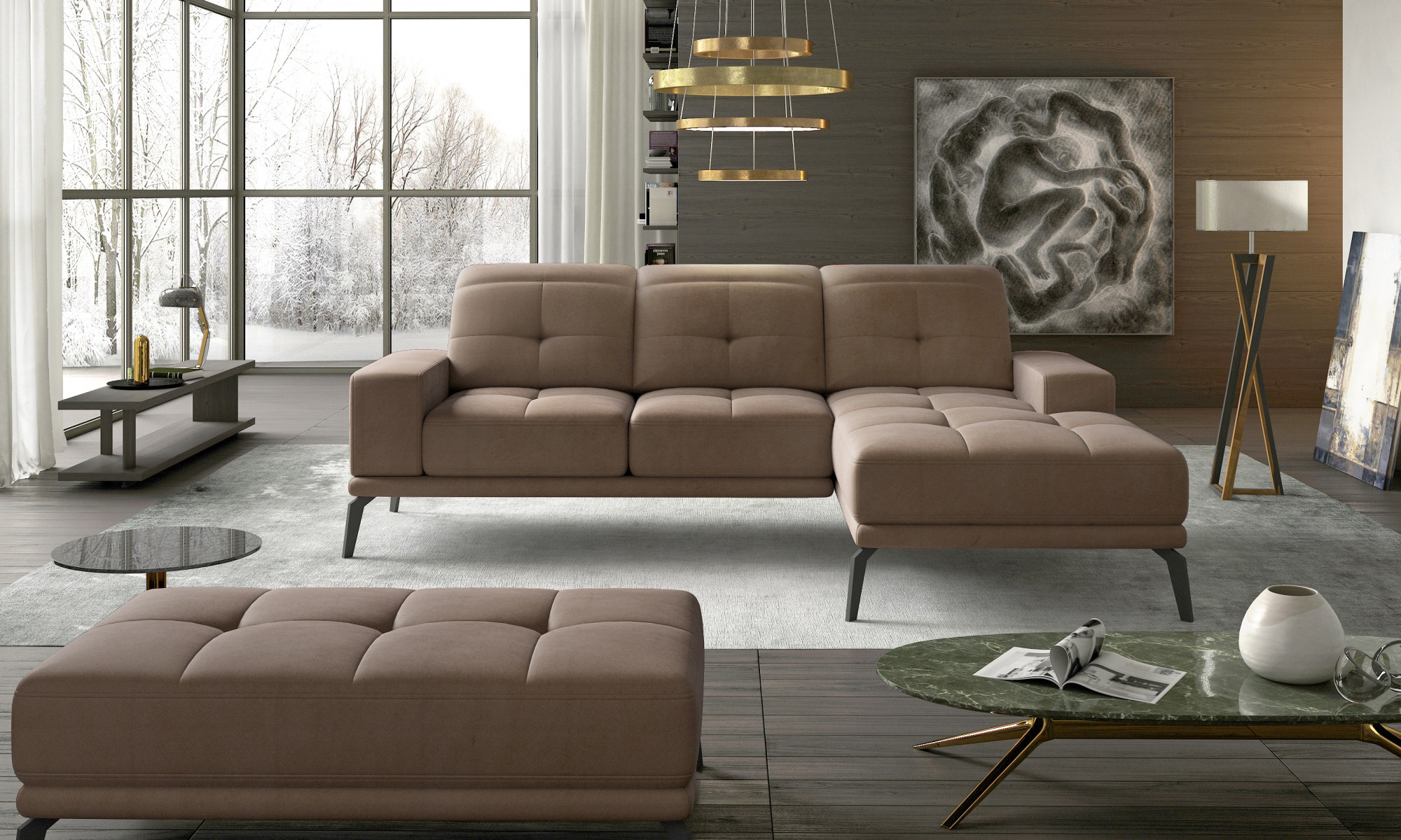 Rohová sedačka Torrense + Puf Monolith 09 140x215 Pravý