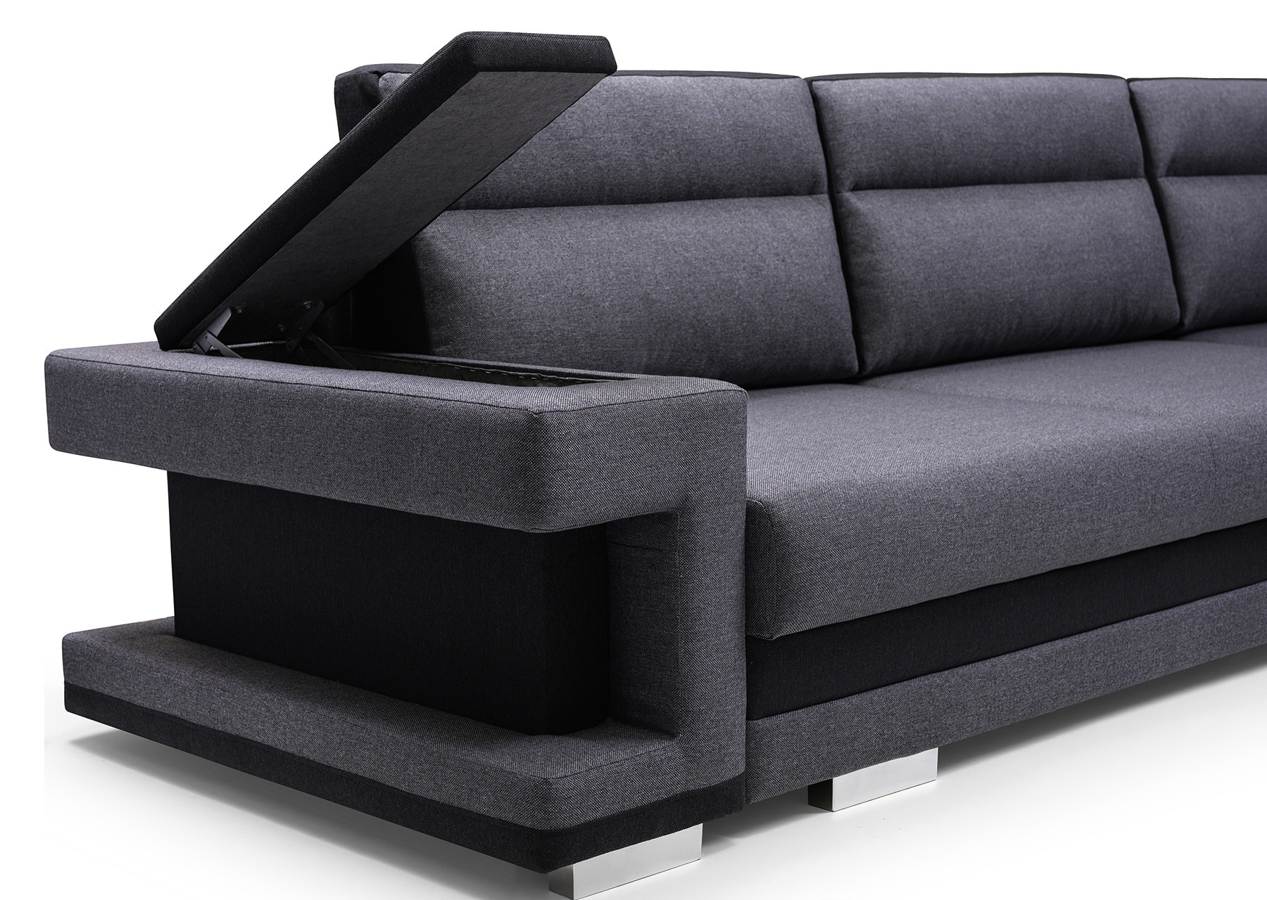 Moderný model rohovej sedacej súpravy A2 je čalúnený látkou, ktorá je k dispozícii v širokej škále farieb a typov látok.