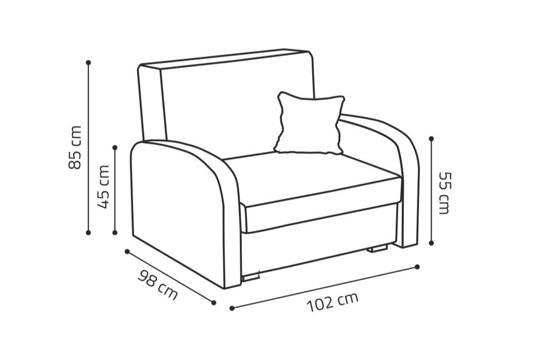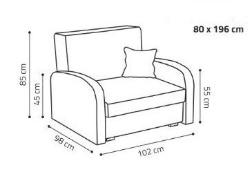 Rozkladaciapohovka Vivian je skvelou voľbou pre tých, ktorí bojujú s úzkymi priestormi. Je vhodný napr. pre detskú, študentskú alebo hosťovskú izbu. Jednoduchým rozložením pomocou stroja získate posteľ na príležitostné prenocovanie návštevy alebo detského kamaráta. Výplň sedáku tvoria vlnité pružiny v kombinácii s PUR penou. Kreslo je čalúnené kvalitnou poťahovou látkou a je k dispozícii v niekoľkých módnych farbách. Kreslo má aj nepostrádateľný úložný priestor, ktorý môžete využiť napr. na prikrývku a vankúš. Cena zahŕňa 1 dekoračný vankúš. Ostatné zobrazené dekorácie nie sú súčasťou balenia. Farby výrobku zobrazené na fotografii sa môžu mierne líšiť od skutočnosti.