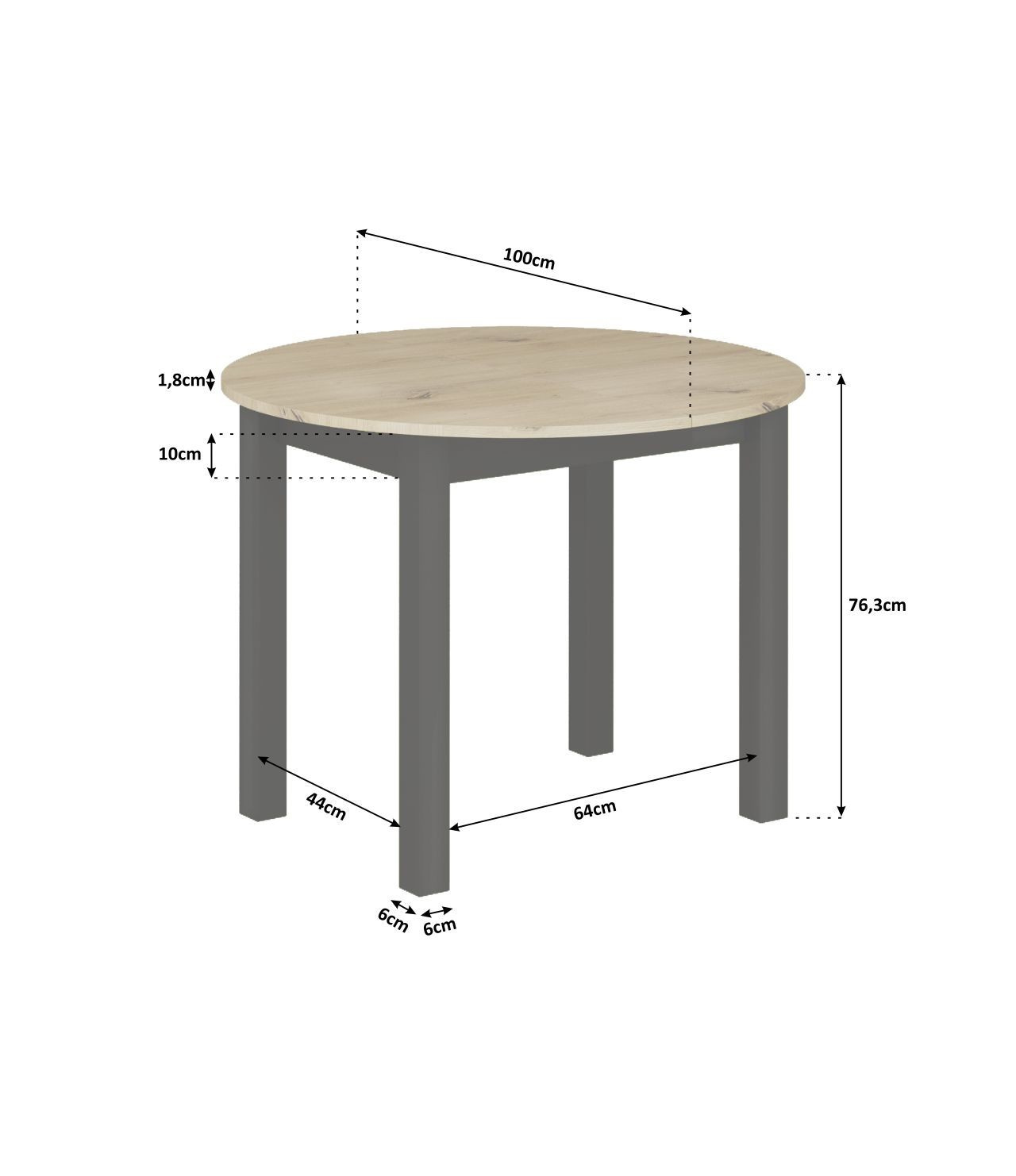 Rozmery: - dĺžka: 100 cm (po rozložení 140 cm) - šírka: 100 cm - výška: 76 cm - hrúbka dosky: 1,8 cm - vložka: 100x40 cm - podrobné rozmery na posledných fotografiách Materiál: - doska + základňa: laminovaná doska, hrany ABS - nohy: MDF Farba: - dub artisan + čierna