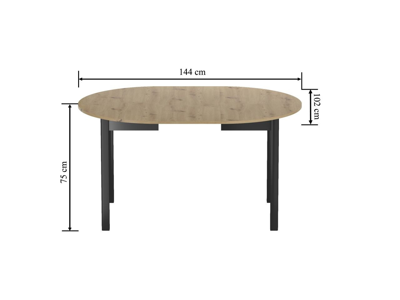 Rozmery: - dĺžka: 100 cm (po rozložení 140 cm) - šírka: 100 cm - výška: 75 cm - hrúbka dosky: 1,8 cm - vložka: 100x40 cm Materiál: - doska + základňa: laminovaná doska, hrany ABS - nohy: MDF Farba: - dub artisan + čierna