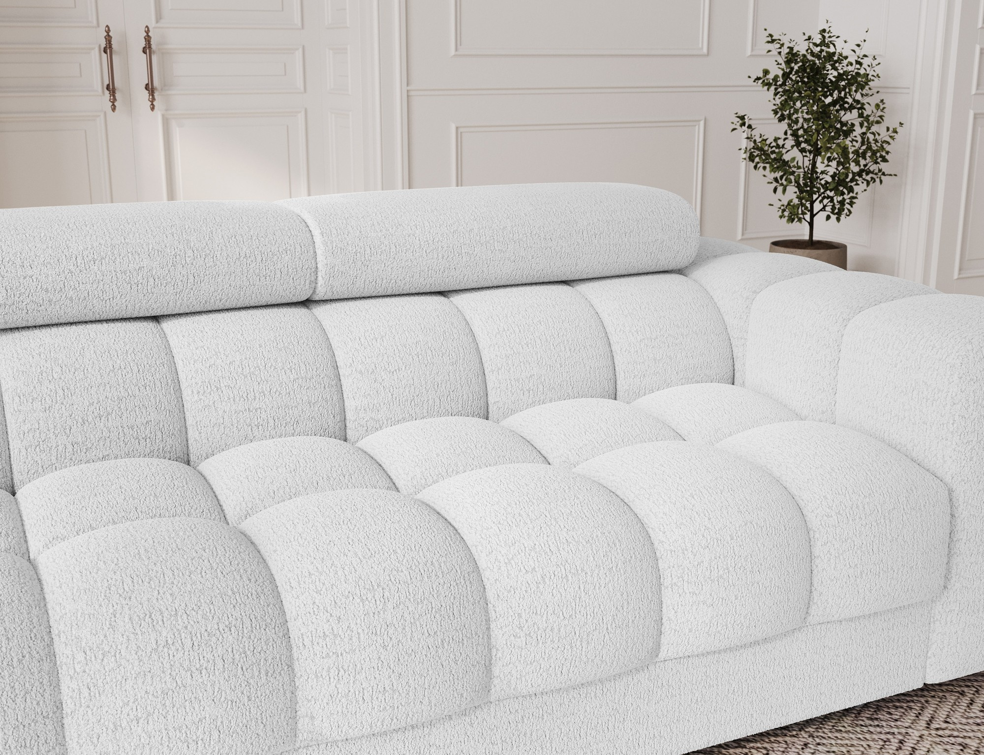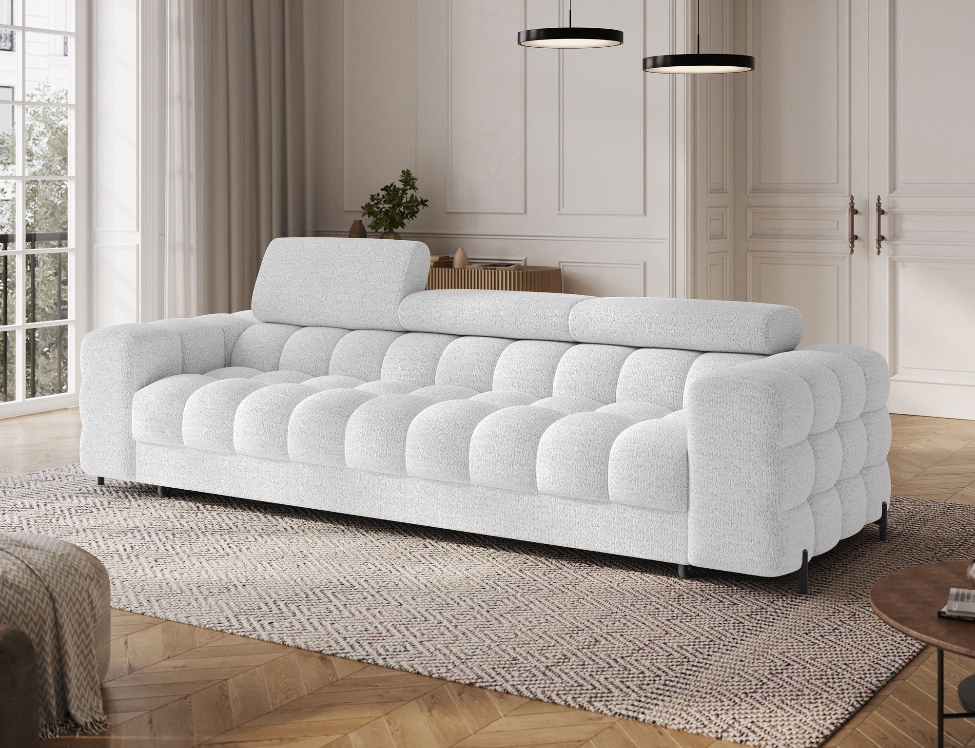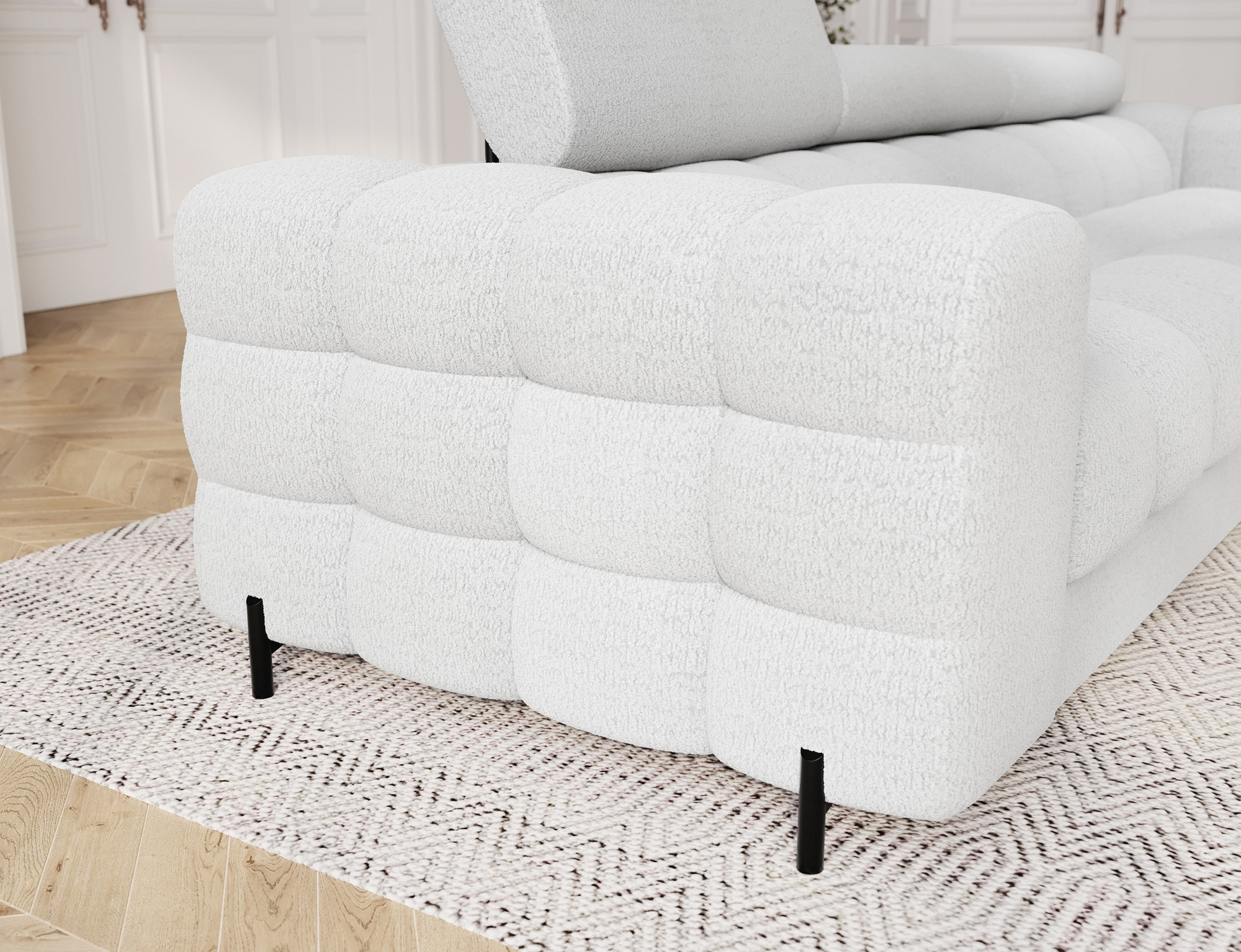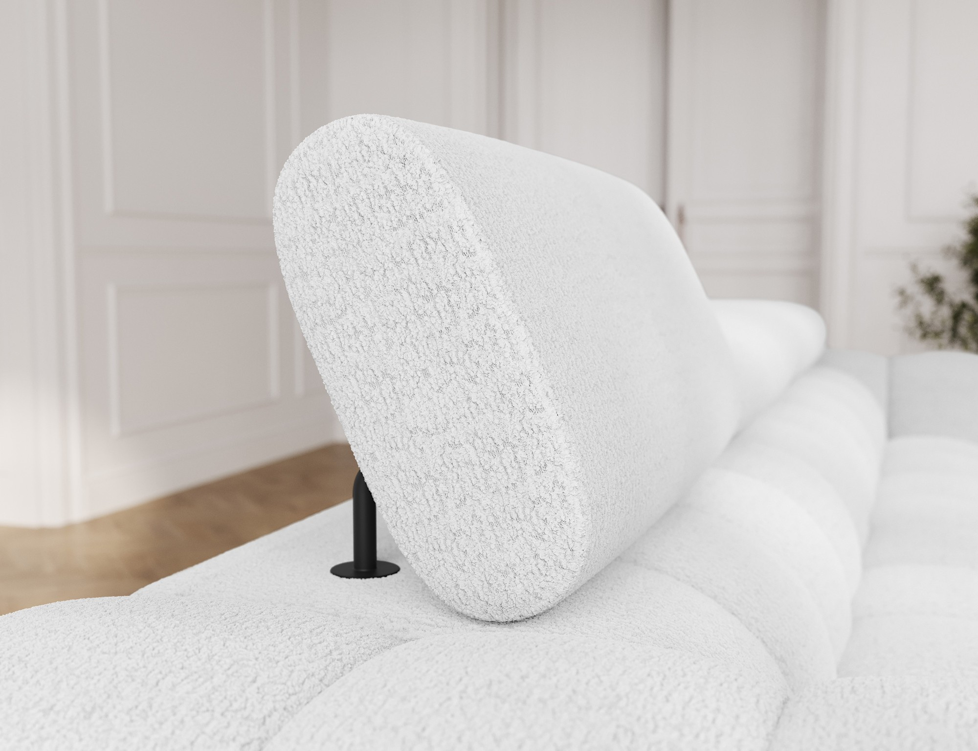 Sedacia časť pohovky je vyrobená z pružín typu Falista a je doplnená o polyuretánovú penu T3030 a HR 3030, čo zaisťuje optimálne pohodlie a podporu. Oporná časť je vyplnená polyuretánovou penou T2130, ktorá poskytuje mäkkú, ale pevnú oporu pre váš chrbát. Polohovateľné opierky hlavy umožňujú prispôsobiť si pohovku presne podľa vašich potrieb a prianí.