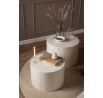 Sada 2 okrúhlych konferenčných stolíkov Dice vyrobených z MDF dosky s dyhou imitujúcou prírodný kameň. Umiestnené pred pohovkou alebo z boku, tieto okrúhle konferenčné stolíky dodajú elegantný vzhľad vášmu obytnému priestoru. Či už stoja spolu, alebo samostatne, vytvárajú vizuálne zaujímavý bod, ktorý priťahuje pozornosť. Ich aerodynamický tvar a dyha imitujúca prírodný kameň prinášajú moderný a mimoriadne elegantný vzhľad, vďaka čomu sa hodia do každého štýlu interiéru. Rozmery stolíkov: väčší: priemer 58 cm, výška 40 cm a menší: priemer 50 cm, výška 33 cm