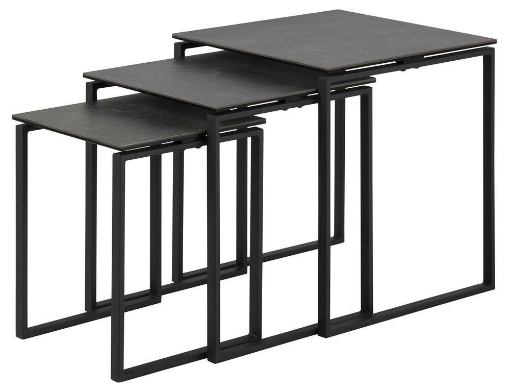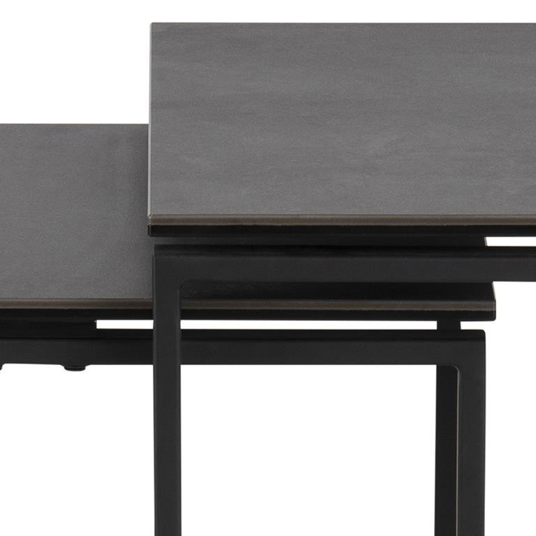 Moderná sada stolíkov Katrine sa skladá z troch stolíkov rôznych veľkostí. Nadčasové spojenie kovu s keramikou vytvára zaujímavú kompozíciu. Keramické štvorcové dosky stolíkov majú hrúbku až 8 mm. Kovová základňa stolíkov bola natretá práškovou farbou na čierno. Rozmery stolíkov (cm): 50x50x55; 43x43x50; 36x36x45 Hmotnosť: 17,3 kg. Rozmery kartónu: 13,3cm x 57,2cm x 53cm