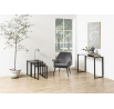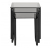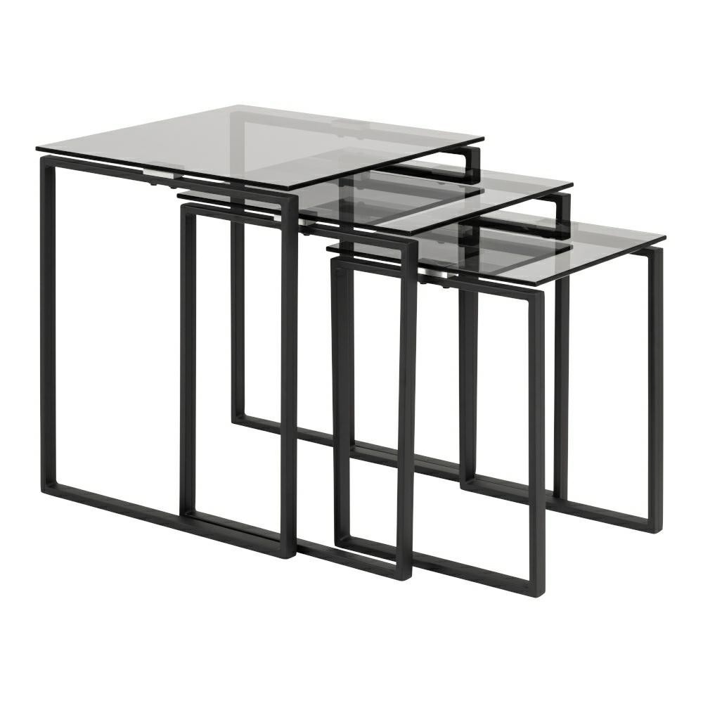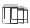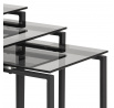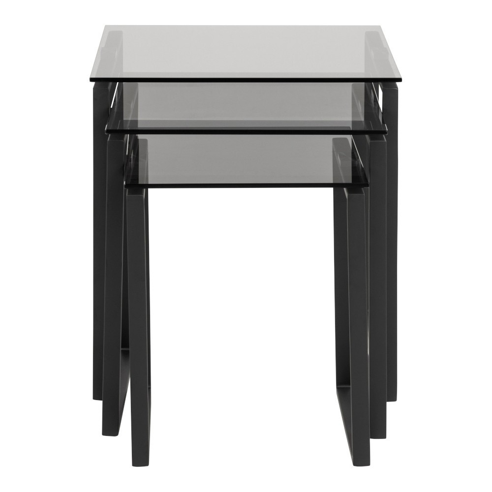 Moderná sada stolíkov Katrine sa skladá z troch stolíkov rôznych veľkostí. Nadčasové spojenie kovu so sklom vytvára zaujímavú kompozíciu. Sklenené štvorcové dosky stolíkov s hrúbkou 8 mm sú vyrobené z dymového skla. Kovová základňa stolíkov bola natretá práškovou farbou na čierno. Rozmery stolíkov (cm): 50x50x55; 43x43x50; 36x36x45 Hmotnosť: 17,3 kg. Rozmery kartónu: 13,3cm x 57,2cm x 53cm